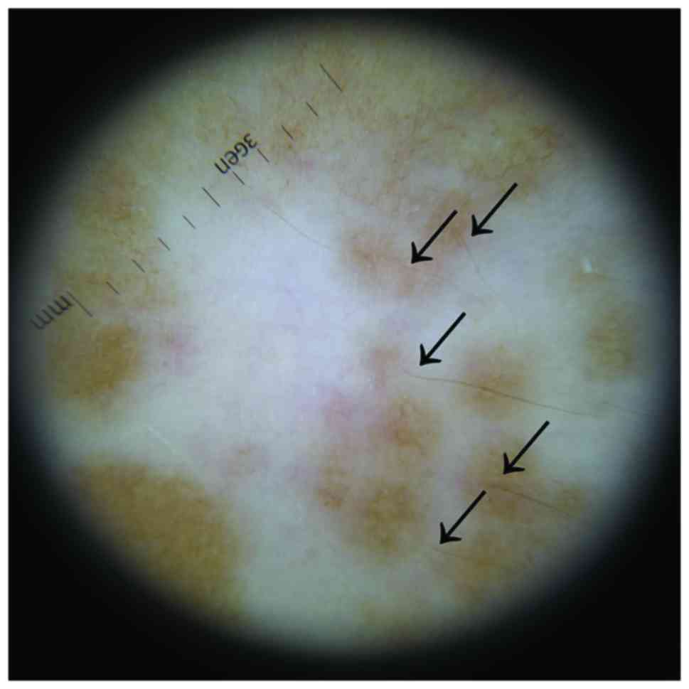 By analyzing the affected areas with a dermatoscope, we were able to see that the pigmentation islands appeared around the pigmented hairs (Fig. 4). This is consistent with the scientific literature affirming that re-pigmentation tends to occur mainly in those areas of skin where there are still pigmented hairs, since this suggests the presence of melanin reservoirs (49).