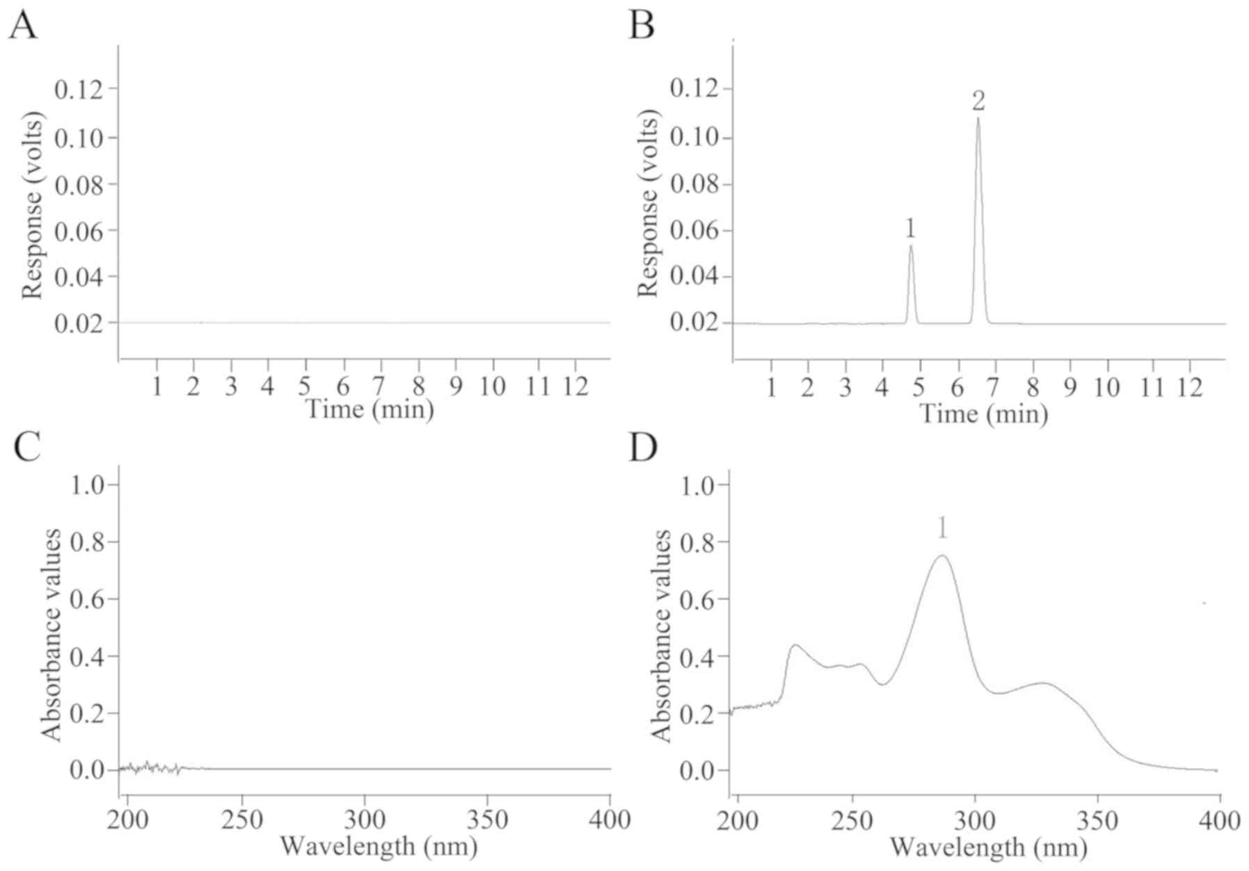 Chromatographic analysis was performed with the use of a Shimadzu liquid chromatograph equipped with a model LC-2010AHT gradient pump, CBM-20A system controller and Shimadzu CLASS-VP UV-Visible detector (Shimadzu Corporation, Kyoto, Japan). The present study also utilized a Sigma D-37520 high-speed centrifuge (Merck KGaA, Darmstadt, Germany), a Kunshan Shu Mei KQ2200B ultrasonic cleaner (Kunshan Ultrasonic Instruments Co., Ltd., Kunshan, China), a Mettler-Toledo one-hundred-thousandth electronic balance (Mettler-Toledo GmbH, Greifensee, Switzerland), an Elix10 water purification system (Milli-Q Gradient A10; EMD Millipore, Billerica, MA, USA), and a UV-2600 UV-Vis spectrophotometer (Shimadzu Corporation). Sample separation was performed on a Sepax BR-C18 column (250×4.6 mm; Sepax Technologies, Inc., Newark, DE, USA), with a particle diameter of 5 µm.