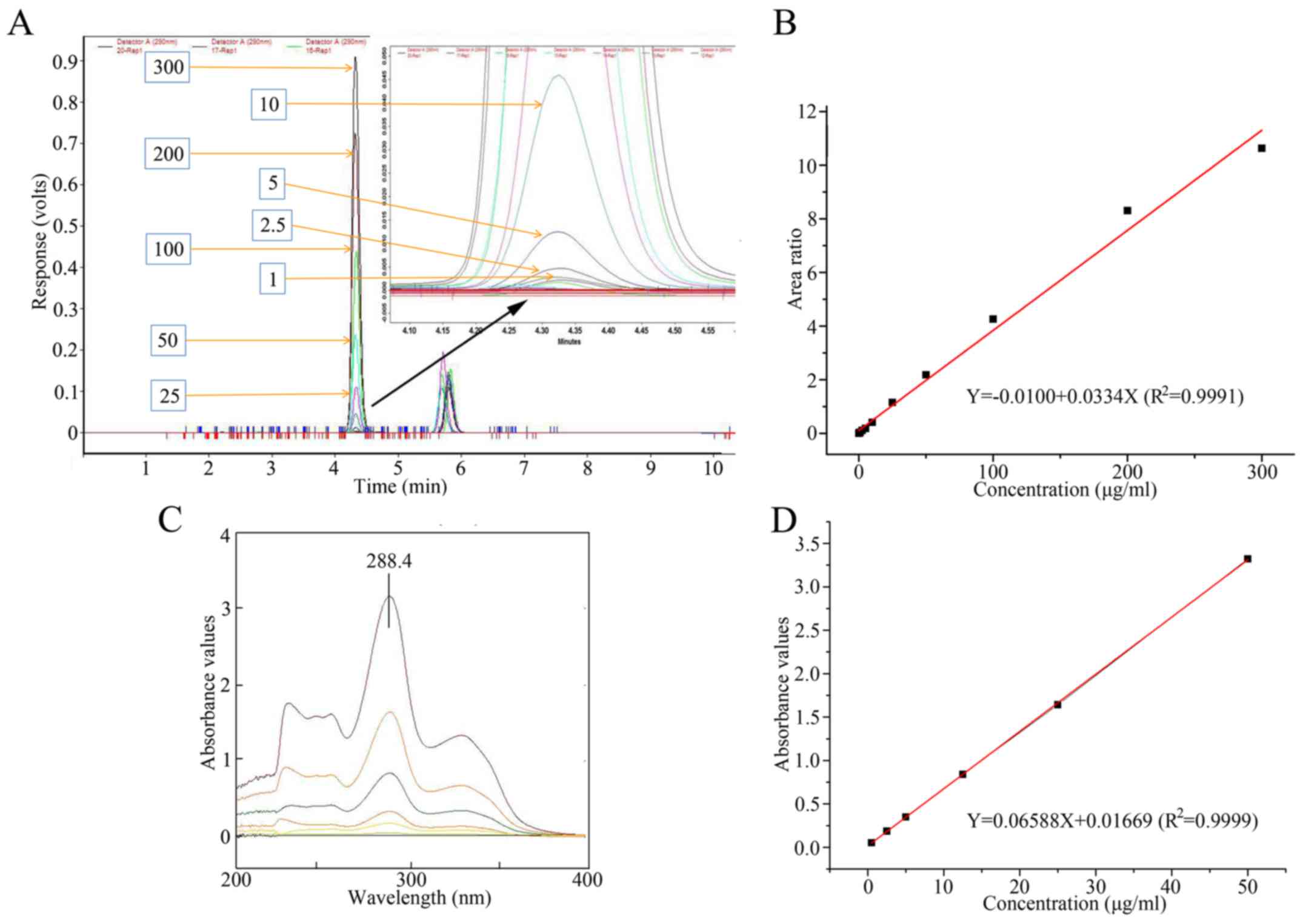 SPSS version 19.0 statistical software (IBM Corp., Armonk, NY, USA) was used for statistical analysis. All quantitative data are presented as the mean ± standard deviation. Linear regression was used to establish the standard curve of the HPLC and UV-Vis methods, respectively. Paired Student's t-test was used to compare the mean concentration obtained from the HPLC and UV-Vis methods. Pearson's correlation analysis was used to analyze the concentration detected by HPLC and UV-Vis methods. The relative standard deviation (RSD) was calculated according to the following equation: Standard deviation/calculated arithmetic mean ×100%. P<0.05 was considered to indicate a statistically significant value.