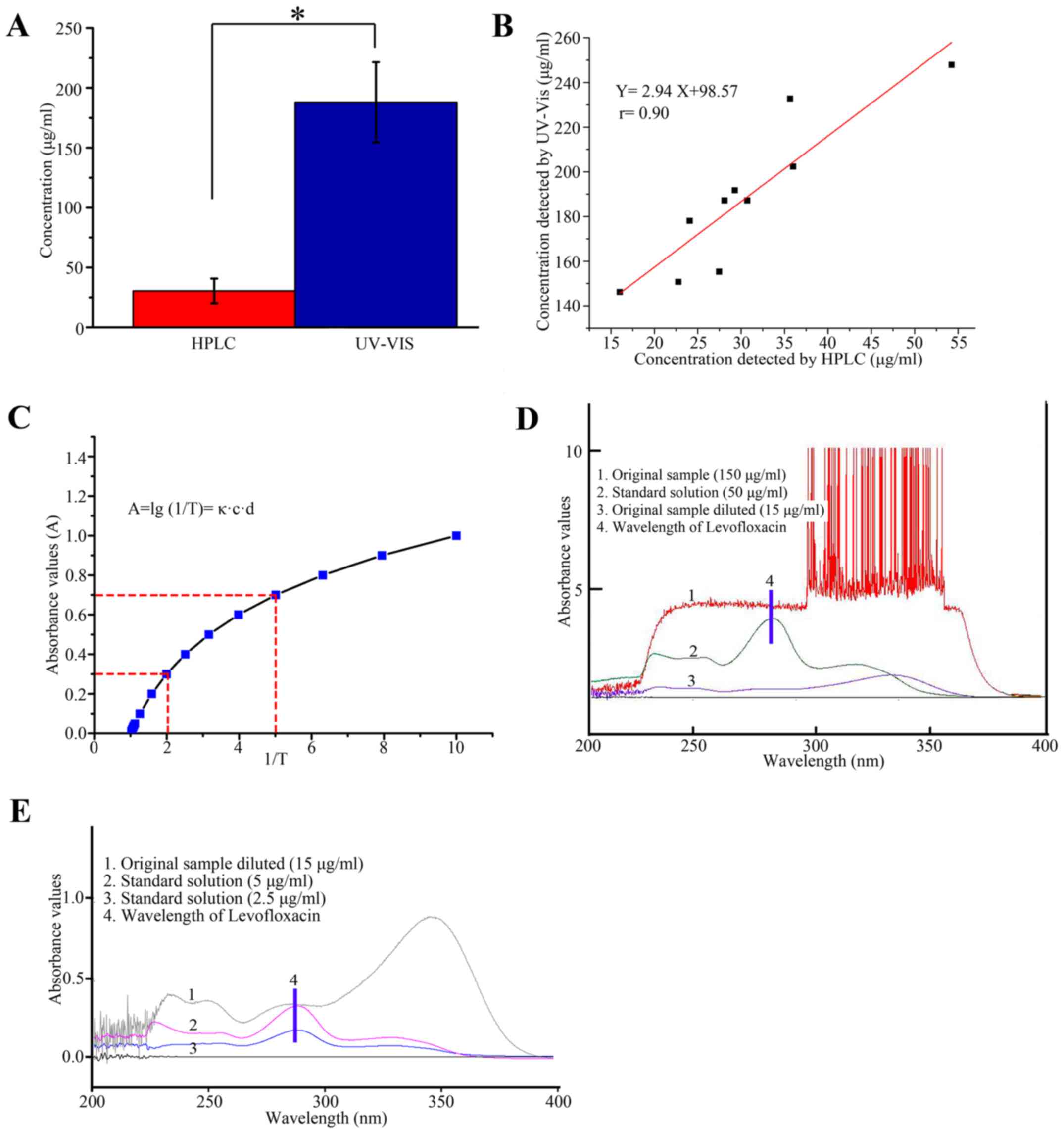 Three different concentration levels of Levofloxacin (low, 5 µg/ml; middle, 25 µg/ml; high, 50 µg/ml) were prepared, respectively. As quality control samples, these were processed and tested using HPLC in accordance with the method described above. The samples were also investigated by UV-Vis. The ratio between the measured concentration and the theoretical concentration was regarded as the method recovery rate.