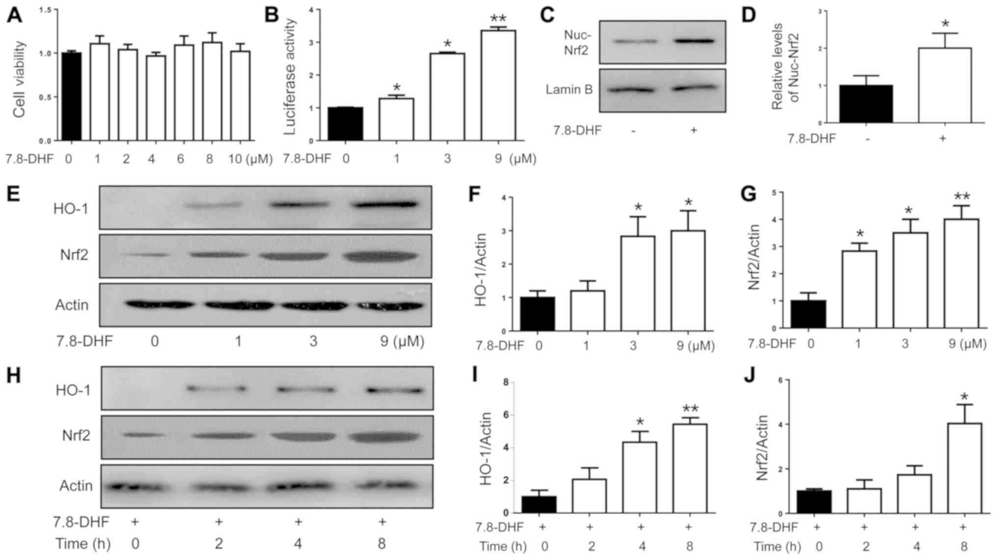 7,8-DHF (purity >99%) was procured from Sigma-Aldrich; Merck KGaA. Anti-Nrf2 (cat. no. BS1258) and anti-HO-1 (cat. no. BS6626) antibodies were supplied by Bioworld Technology at a dilution of 1:1,000. Anti-actin (cat. no. 4970) and anti-lamin B (cat. no. 13435) antibodies were obtained from Cell Signaling Technology, Inc. at a dilution of 1:5,000. Secondary HRP-conjugated goat anti-rabbit (cat. no. BS13278) antibody was purchased from Bioworld Technology, Inc. and used at a dilution of 1:5,000. The Cell Counting Kit-8 (CCK-8) and nuclear protein extraction kit were purchased from Beyotime Institute of Biotechnology. The superoxidase dismutase (SOD) and malondialdehyde (MDA) assay kits were supplied by Nanjing Jiancheng Bioengineering Institute. The fluorescent probe 2′,7′-dichlorodihydrofluorescein diacetate (H2DCFDA) was obtained from Molecular Probes; Thermo Fisher Scientific, Inc.