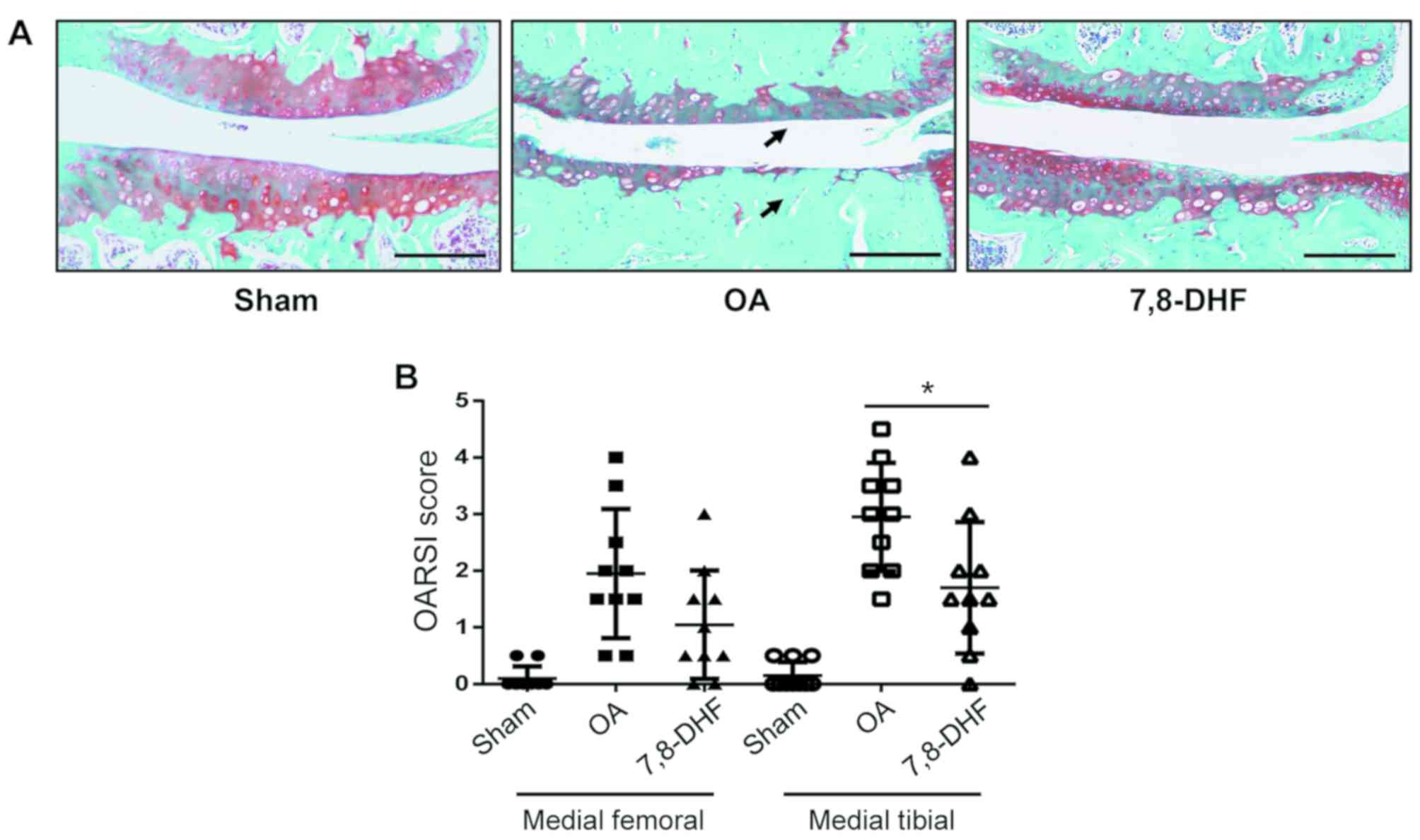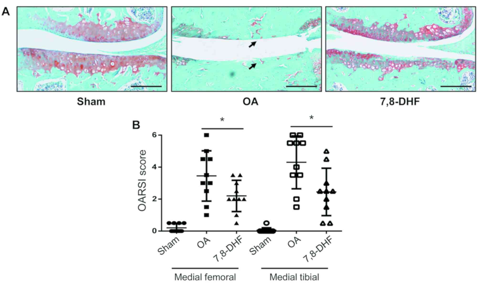 A total of 92 wild-type B6 mice (8–10 weeks old) were used in the experiments and were housed in standard mouse cages (10 animals per cage) in specific-pathogen-free conditions under a light-dark cycle of 12:12 h at 25±2°C with standard mouse food (RM3; Special Dietary Systems) and water ad libitum. Animal health and behavior were monitored every 12 h. When pain/distress were observed, the animals were treated with Buprenex (Reckitt & Colman Pharmaceuticals, Inc.; 0.1–2.0 mg/kg), in addition to crushed or wet food. If pain or distress continued, the mouse was sacrificed regardless of the scheduled endpoints. The criteria that determined discomfort/distress/pain were any three of the following signs: Abnormal posture, a slow, careful or abnormal (waddling) gait, low activity levels, slow eating, cowering or vocalizing on handling, a change in eye or coat appearance, and weight loss. Sacrifice was confirmed by one of the following criteria: Cervical dislocation following no response to tail or toe pinch, no respiration or heartbeat following continuous monitoring for 30 sec, or rigor mortis. All procedures were performed in accordance with the Nanjing Medical University Institutional Animal Care and Use Committee (Nanjing, China) guidelines. The mice were anesthetized by inhalation of ether during OA surgery. OA was induced following sectioning of the medial meniscotibial ligament, also known as the coronary ligament, which connects the medial meniscus to the periphery of the tibial plateau, and mice undergoing sham surgery were used as a control (12,13). 7,8-DHF (Sigma-Aldrich; Merck KGaA) was subsequently dissolved in ethanol and phosphate-buffered saline (PBS). 7,8-DHF was administered by intraperitoneal injections (5 mg/kg) once a week postoperatively. The knee joints of the mice were harvested 4 and 8 weeks postoperatively, and were stained with Safranin O/Fast Green for assessment using the OARSI scoring system for histologic alterations (14). The mounted slides were placed in 70% ethyl alcohol for 15 min and then stained with 0.04% safranin O/sodium acetate buffer (pH 4.0), for 10 min at 22°C.