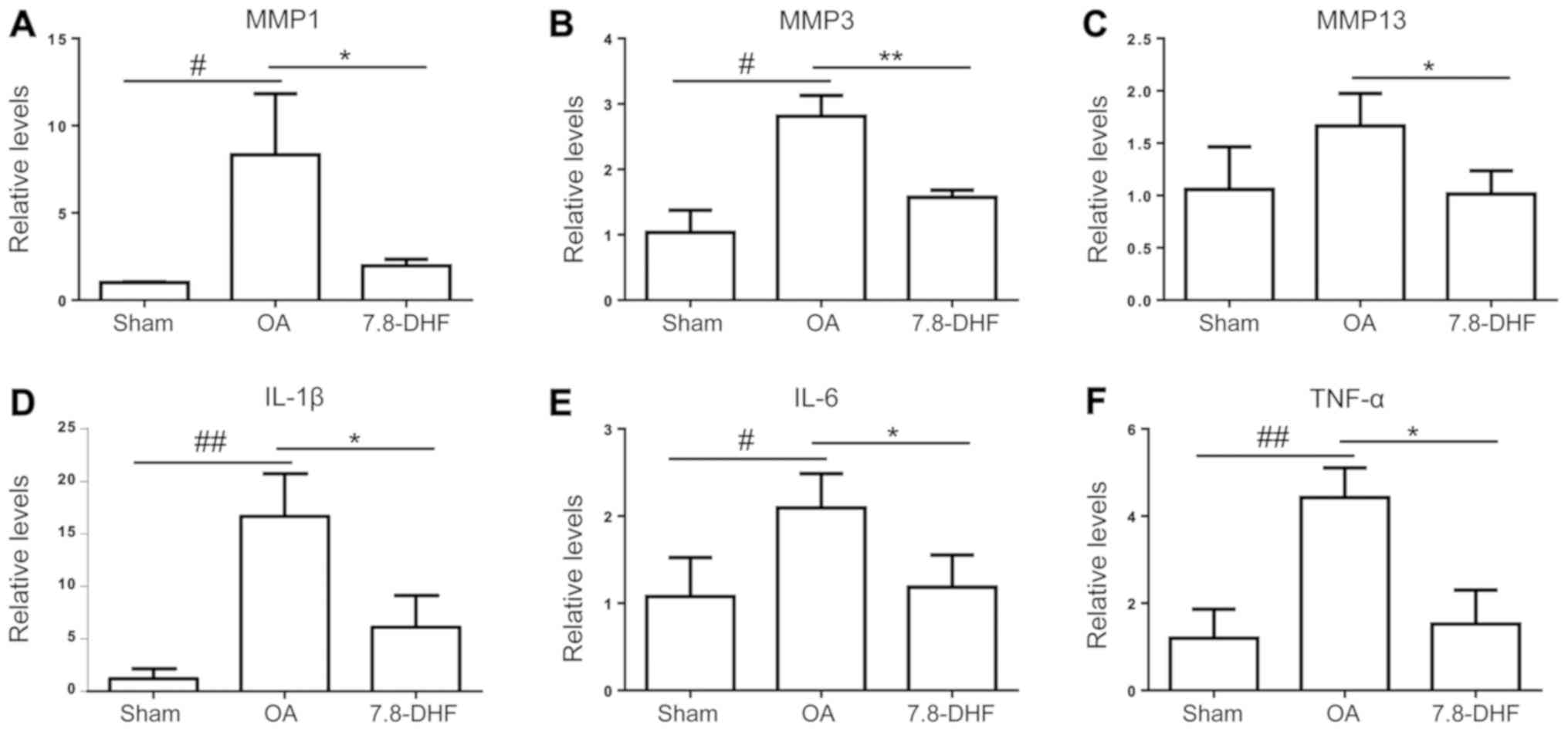 The cartilage of the knee joints was used to examine changes in the OA-associated mRNA expression levels via RT-qPCR analysis. Consistent with the histopathological results, the cartilage of the OA group exhibited significantly higher mRNA expression levels of TNF-α, IL-1β, IL-6, MMP-1, MMP-3 and MMP-13 compared with that in the sham group, and the upregulated gene expression levels were suppressed by 7,8-DHF (Fig. 5A-F).
