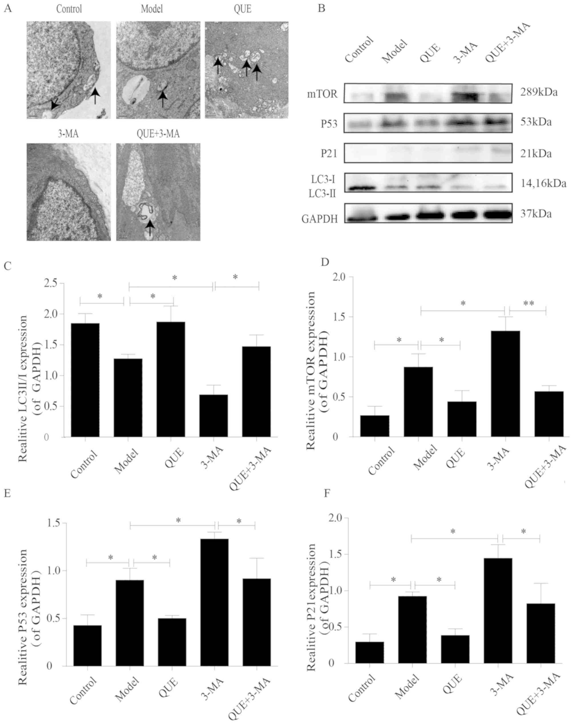 The aortas of mice in the Control group exhibited higher of LC3 II/I ratios and lower expression levels of mTOR, P53 and P21 compared with the Model group, which had lower LC3 II/I ratio (P<0.05; Fig. 4B and C) and higher expression levels of mTOR (P<0.05; Fig. 4B and D), P53 (P<0.05; Fig. 4B and E) and P21 (P<0.05; Fig. 4B and F). Compared with the Model group, the QUE group exhibited higher ratio of LC3 II/I and lower expression of mTOR, P53, and P21 (P<0.05; Fig. 4B-F); and the 3-MA group exhibited lower ratios of LC3 II/I and higher expression levels of mTOR, P53 and P21 (P<0.05; Fig. 4B-F). Compared with the 3-MA group, the QUE + 3-MA group exhibited higher ratios of LC3 II/I (P<0.05; Fig. 4B and C) and lower expression levels of mTOR (P<0.01; Fig. 4B and D), P53 and P21 (P<0.05; Fig. 4B, E and F).