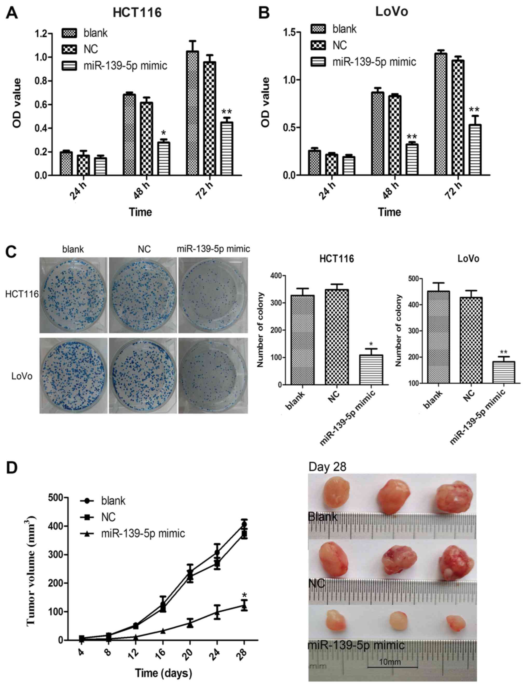 Li Q, Liang X, Wang Y, Meng X, Xu Y, Cai S, Wang Z, Liu J and Cai G: miR-139-5p inhibits the epithelial-mesenchymal transition and enhances the chemotherapeutic sensitivity of colorectal cancer cells by downregulating BCL2. Sci Rep. 6:271572016. View Article : Google Scholar : PubMed/NCBI