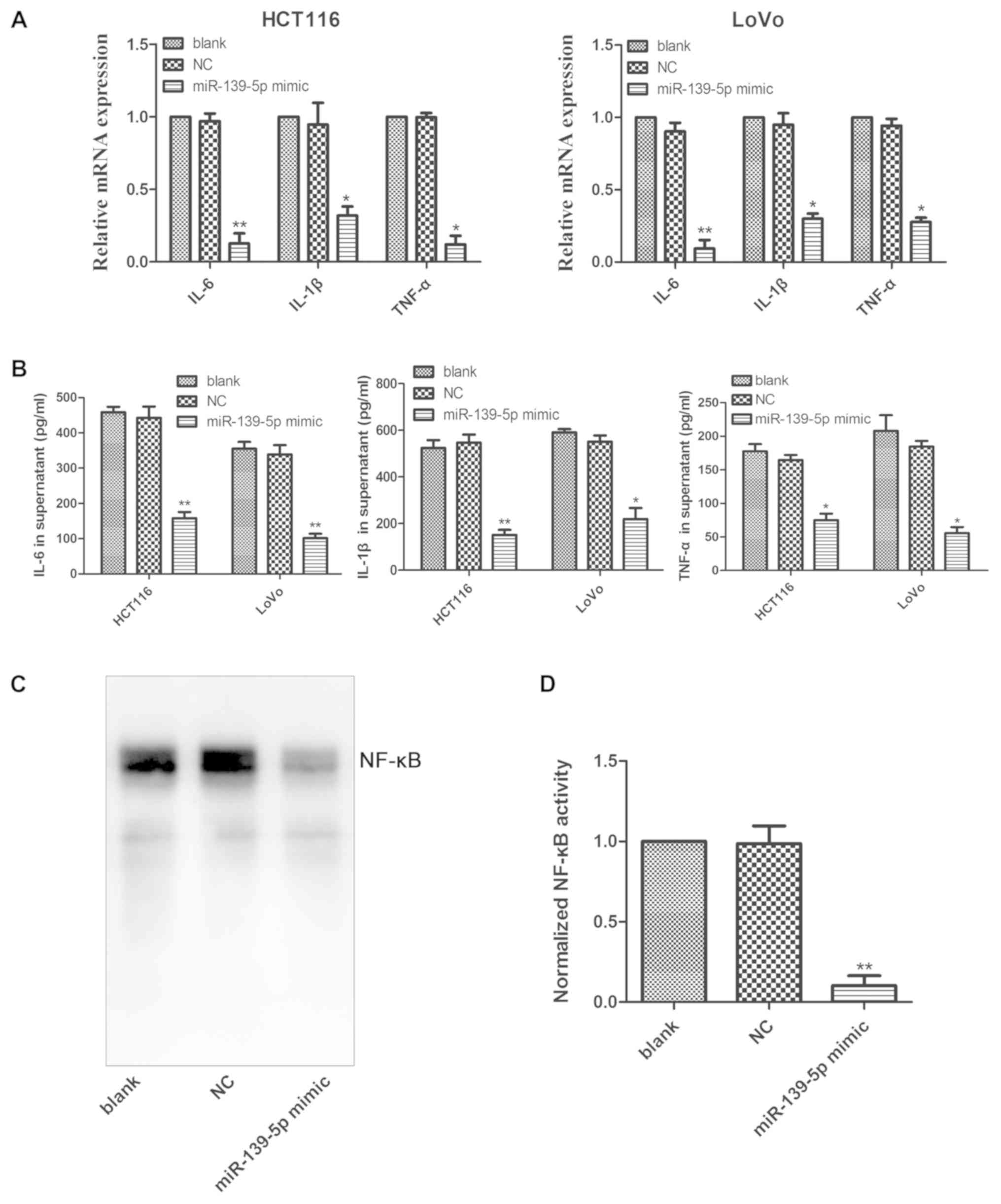 Zhu M, Zhang W, Ma J, Dai Y, Zhang Q, Liu Q, Yang B and Li G: MicroRNA‑139‑5p regulates chronic inflammation by suppressing nuclear factor‑κB activity to inhibit cell proliferation and invasion in colorectal cancer. Exp Ther Med 18: 4049-4057, 2019.