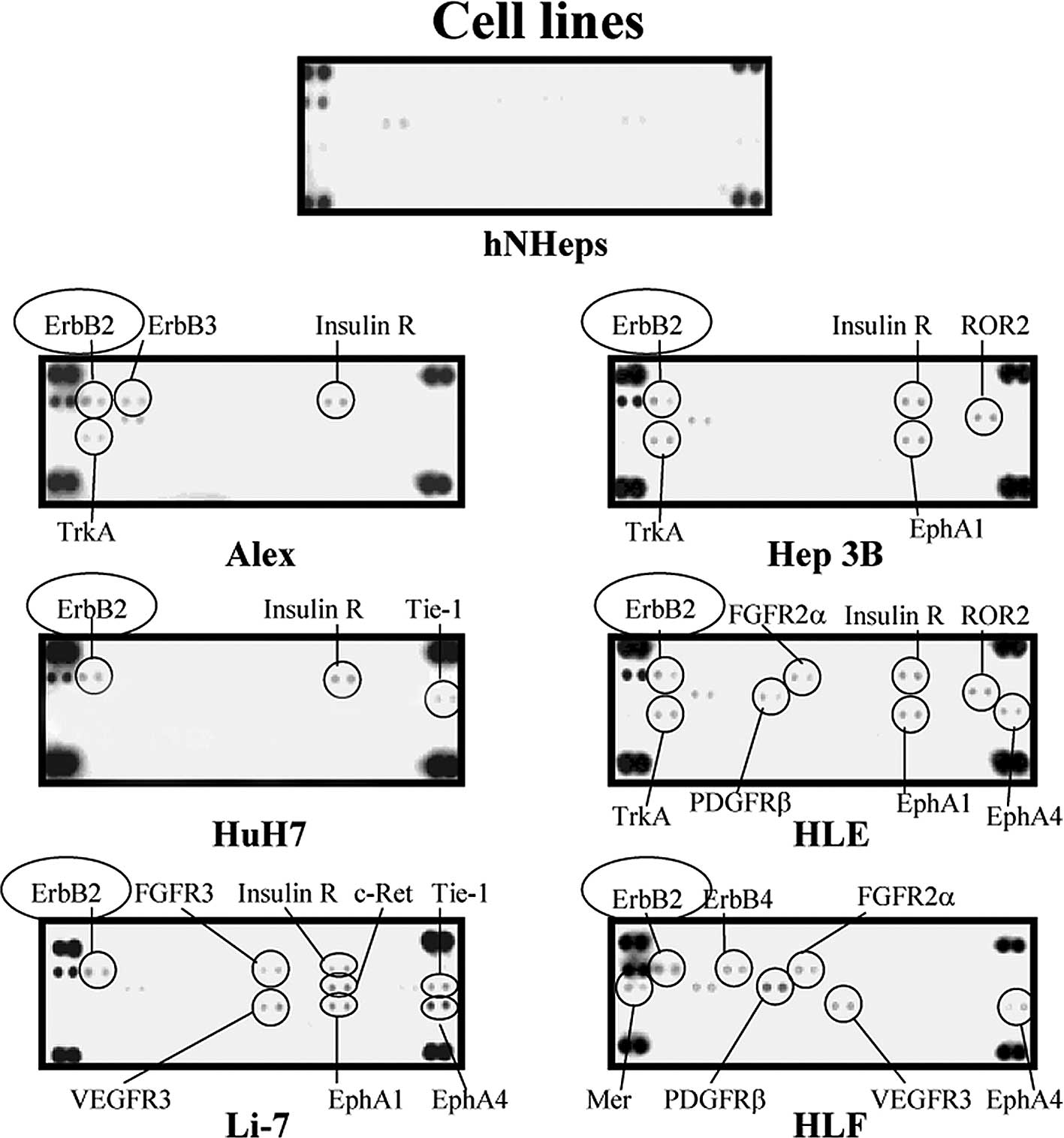 Our studies demonstrated that ErbB2, ErbB3, ErbB4, insulin R, ROR2, TrkA, EphA1, Tie-1, FGFR2α, FGFR3, PDGFRβ, EphA4, c-Ret, VEGFR3 and Mer were up-regulated in some of the cancer cell lines studied. Overexpression of ErbB2, ErbB3, TrkA, EphA1, Tie-1, FGFR2, FGFR3, PDGFR, Ret and VEGFR3 was previously reported in HCC (38–46). These previous reports support our results on the various RTKs activated in HCC derived from the protein array in this study. In summary, our results suggest that protein arrays aid in studying the expression of activated RTKs in various tissues, including malignant tissues. Furthermore, these results suggest that the immunological inhibition of ErbB3, ErbB4, insulin R, ROR2, TrkA, EphA1, Tie-1, FGFR2α, FGFR3, PDGFRβ, EphA4, c-Ret, VEGFR3 and Mer in addition to ErbB2 also have an anti-tumor effect for certain cases of HCC.