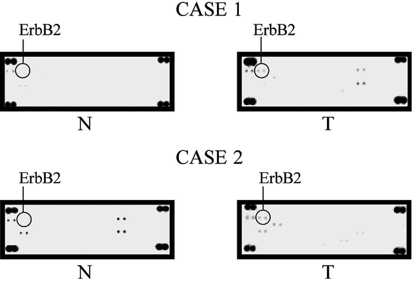 A phospho-RTK array system was used to identify the ‘key RTKs’ that are associated with HCC. Using the antibody array, the expression of 42 different activated RTKs were simultaneously screened (Fig. 1). Compared to the hNHeps cell line, ErbB2, ErbB3, ErbB4, FGFR2α, FGFR3, insulin R, Mer, PDGFRβ, c-Ret, ROR2, Tie, TrkA, VEGFR3, EphA1 and EphA4 were up-regulated in some of cancer cell lines studied (Fig. 2). One of these molecules, ErbB2 (•), was up-regulated in all of the HCC cell lines examined in this study, while it was not detected in the hNHeps cell line. Also, in the cancerous tissue, ErbB2 was the only RTK up-regulated in all five tissue samples (Fig. 3). These results suggest that an ErbB2-targeting drug is a useful agent for the treatment of HCC.