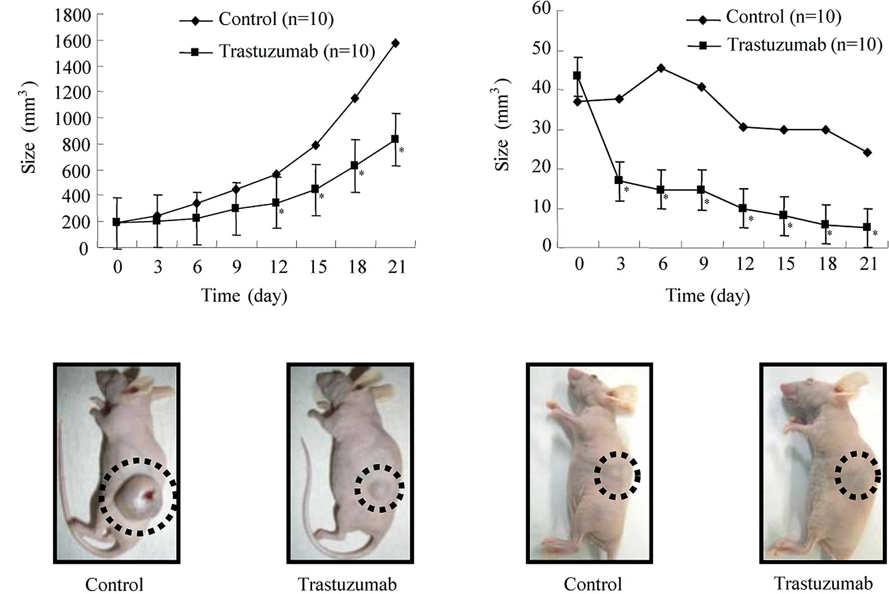 As shown in Fig. 4C, the tumor size increased until the sixth day after implantation in the control animals implanted subcutaneously with HLF cells, but decreased gradually thereafter. By contrast, the animals in the trastuzumab group exhibited significantly retarded tumor development, and the tumors in 4/5 animals disappeared. Fig. 4D shows representative images of gross HLF tumors from the nude mice treated with either trastuzumab or the vehicle. The tumors in the trastuzumab group disappeared completely while the tumors in the control group did not disappear.