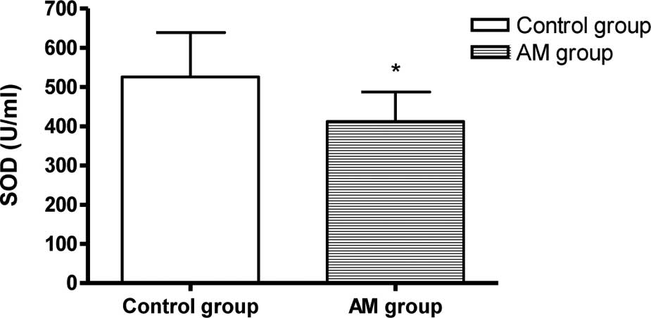 The SOD activity decreased and the MDA content increased markedly in the hearts of the AM group mice compared to the control group (P<0.05, Fig. 1).