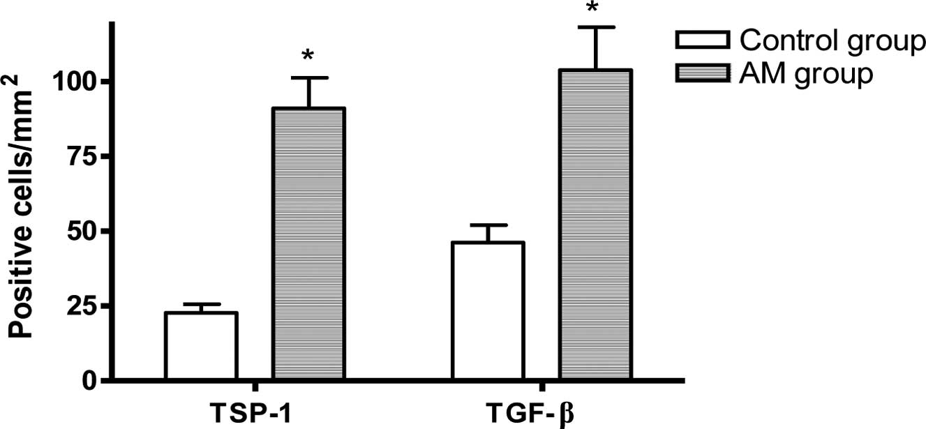 Compared to the control group, in the hearts of the AM group, the numbers of TSP-1 or TGF-β-positive-immunostained myocardial cells were significantly increased (P<0.05, Figs. 3–5).