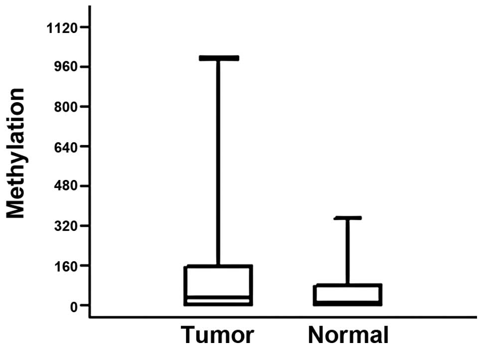 Tissue samples were collected from 71 patients with colorectal cancer who underwent surgery for tumor resection. Methylation of the p16INK4A gene promoter was analyzed by quantitative real-time PCR in the tumors and matched normal tissue samples from the patients. Methylation at the p16INK4A promoter was higher in the tumors from 38 patients (53.5%) when compared with the normal tissue of the same individuals (Fig. 1). The median methylation levels were 24 for tumor tissue and 3.5 for normal tissue. However, due to the wide range of the values the difference was not significant (P=0.06). We also did not identify any significant correlation between the methylation levels and clinical parameters, including lymph node status, metastasis, stage and tumor location.