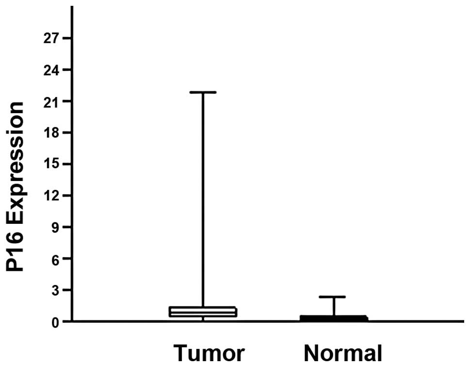 RNA samples were available from tumors of 41 patients. p16INK4A mRNA levels were measured by real-time quantitative RT-PCR using the LightCycler 480 instrument (Roche Applied Science, Indianapolis, IN, USA) and UPL probes.