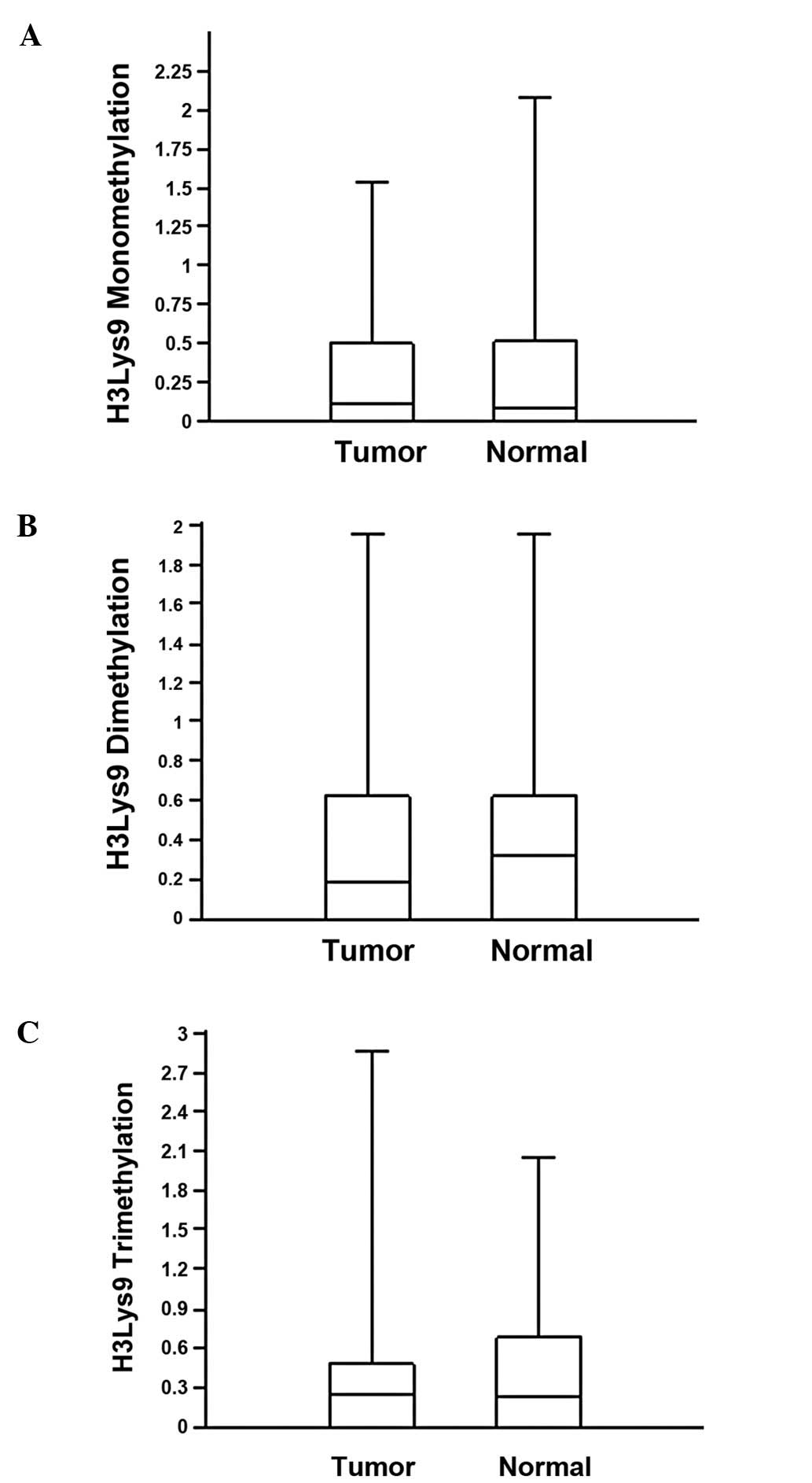 To determine the correlation between p16INK4A methylation and chromatin remodelling, mono-, di- and trimethylation of the H3K9 residue was analyzed by chromatin immunoprecipitation and real-time PCR. The values of H3K9 mono-, di- and trimethylation for the normal and tumor tissues were similar (Table II). The median values of monomethylation for the tumor and normal tissue samples were 0.112 and 0.08, respectively (Fig. 3A). Median values for di- and trimethylation in the tumors and normal tissue were 0.187 vs. 0.325 and 0.257 vs. 0.234, respectively (Fig. 3B and C). The difference between the methylation levels of H3K9 in the normal and tumor tissues was not significant (Mann-Whitney U test, P>0.05). The expression level of the p16INK4A gene was not associated with mono-, di- or trimethylation for the tumor (P=0.404, P=0.457 and P=0.465, respectively) or normal (P=0.288, P=0.62 and P=0.667, respectively) samples.