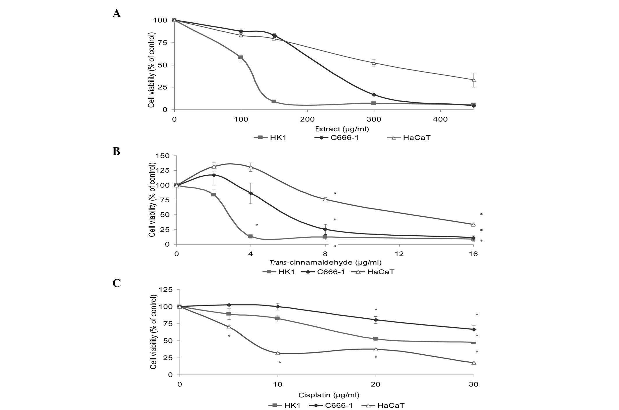 Cinnamomum burmannii Blume (Lauraceae) is a tree-like shrub that is native to Southeast Asia and Indonesia (4). The aromatic bark is used for medicine and making spices for the flavor industry (5). Trans-cinnamaldehyde (TCA) has been identified as one of the bioactive compounds in C. burmannii(6). Numerous reports on the anti-cancer activities of Cinnamomum have been published (7–9). Additionally, studies have demonstrated that TCA inhibits cell proliferation and induces cell apoptosis (10–13). Despite the extensive research on the effect of TCA on a variety of cell lines, studies concerning its anti-proliferative effect on NPC cells are limited. Therefore, the present study addresses the anti-neoplastic potential of the methanol extract of the C. burmannii stem and its constituent, TCA, on HK1 and C666-1 NPC cell lines. We also explored the potential of combining TCA with conventional cytotoxic chemotherapy for more successful elimination of NPC cells.