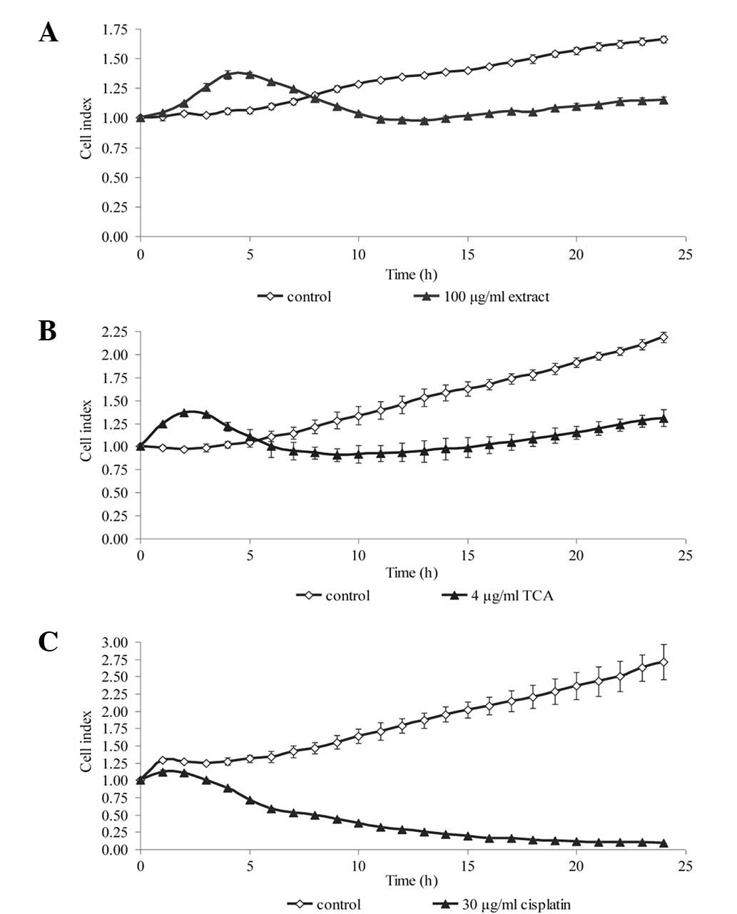 Cells (5,000–15,000 cells/well) were seeded into E-Plate 16 devices (ACEA Biosciences Inc., San Diego, CA, USA) containing 100 μl culture medium. Upon reaching the logarithmic phase, the culture medium was aspirated and replaced with culture medium containing either 100 μg/ml methanol extract or 4–8 μg/ml TCA. The methanol extract was dissolved in DMSO, to a final concentration not exceeding 0.5%. Vehicle control cultures received DMSO alone. Cells treated with cisplatin served as the positive control. Dynamic monitoring of the growth inhibition pattern was determined by the impedance-based xCELLigence system (Roche Applied Science, Mannheim, Germany) for 24 h at 37°C in a humidified atmosphere of 5% CO2. The cell index, automatically calculated from the change in electrical impedance as the living cells interacted with electrodes in the E-Plate wells, correlated with the number of cells, viability and/or cytotoxicity over time.