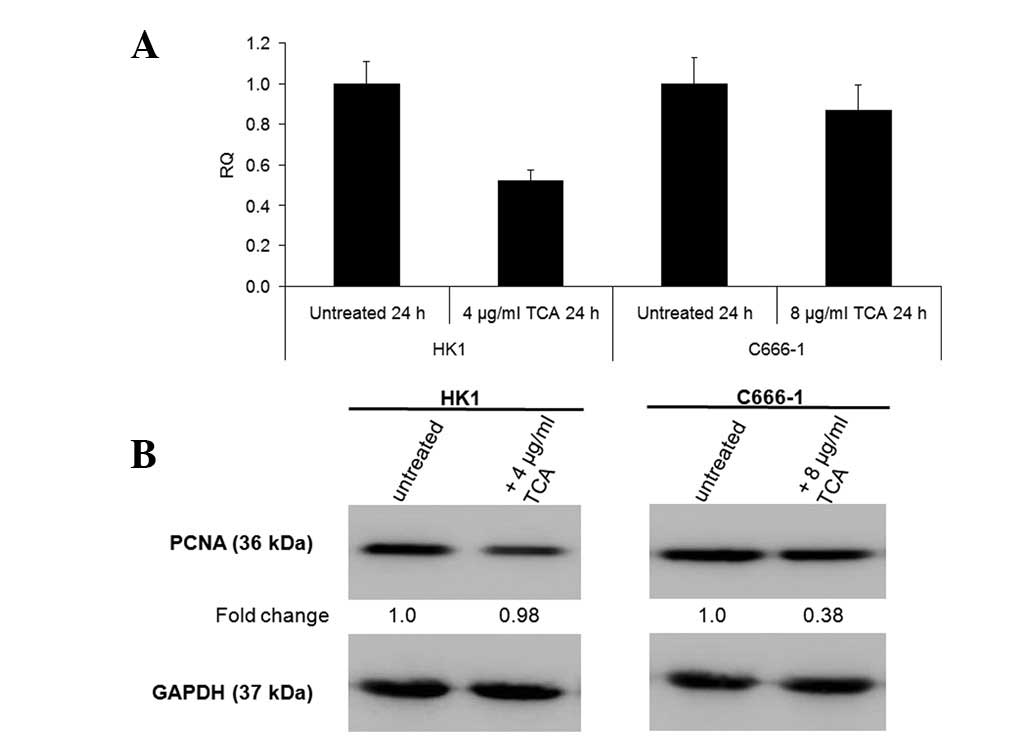 Since TCA, rather than the methanol extract, exhibited greater efficacy at inhibiting growth, all further experiments conducted concerned TCA only. We further verified the ability of TCA to inhibit growth by demonstrating that it decreased the mRNA levels of Ki67 proliferation antigen and protein levels of PCNA (Fig. 5).
