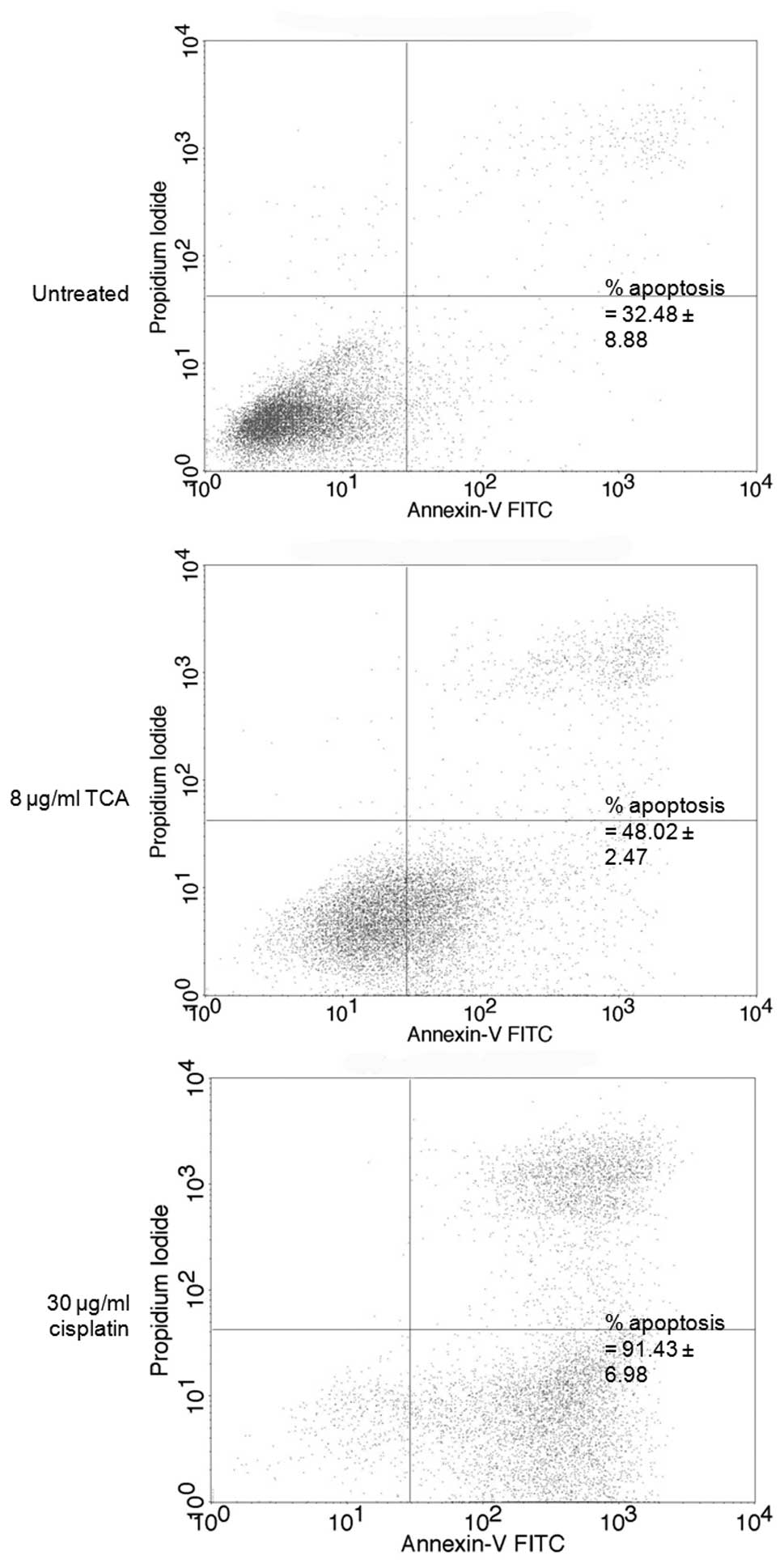 HK1 cells were seeded in 10-cm culture dishes to reach confluence overnight. Following this, the cells were treated with 8 μg/ml TCA, 30 μg/ml cisplatin or left untreated (as the control). All culture dishes were re-incubated for a further 24 h. Apoptosis was determined with a FACSCalibur flow cytometer (BD Biosciences, San Jose, CA, USA), using the fluorescein isothiocyanate (FITC) Annexin V apoptosis detection kit (BD Pharmingen, San Diego, CA, USA), according to the manufacturer’s instructions.