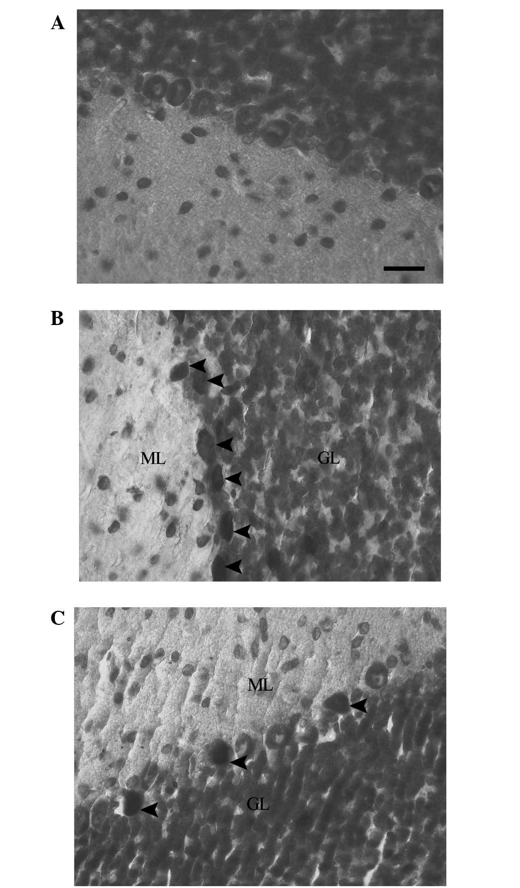 The rats were perfused first with phosphate-buffered saline under ethyl ether anesthesia, and then with 4% buffered paraformaldehyde. The rat brains were dissected and postfixed in the same fixative. Following fixation, coronal blocks of the cerebellar cortex were embedded in paraffin and sectioned at 5 μm. The paraffin sections were studied with caspase-3 immunostaining, using the avidin-biotin peroxidase (ABC) and horseradish peroxidase-streptavidin methods for anti-caspase-3 rabbit polyclonal antibodies (1:50 dilution; Diagnostic Biosystems, Pleasanton, CA, USA). The paraffin-embedded tissue slices were deparaffinized with xylene, and the endogenous peroxidase activity was prevented by incubation in 0.3% hydrogen peroxide in methanol. The tissue slices were hydrated with graded alcohol, treated with 10% normal serum and then incubated with the primer antibody at 4°C overnight. They were then incubated with biotinylated anti-mouse IgG or biotinylated anti-rabbit IgG for 30 min at room temperature. Subsequently, the tissues were incubated with avidin-biotinylated horseradish peroxidase or streptavidin horseradish peroxidase in 10% normal goat serum for 30 min at room temperature. Following this, the slices were visualized using 3-amino-4-ethylcarbazole (AEC) as a chromogen. The negative controls consisted of tissue sections incubated in the absence of the primary antibody. The sections were then mounted for counting.