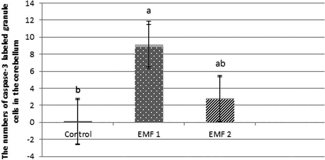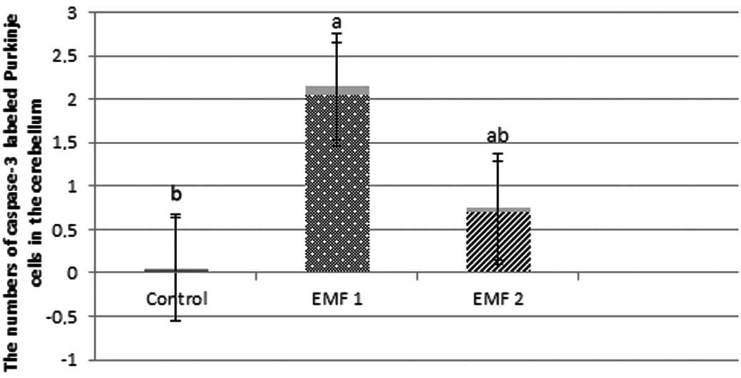 EMF exposure has been been demonstrated to induce apoptosis in the human colon (31) and epidermoid cancer cells (32); however, EMF exposure was not observed to induce apoptosis in human peripheral mononuclear blood cells (33) or lymphocytes (34). McNamee et al reported that there was no increase in apoptosis in the cerebellums of immature mice subjected to acute EMF exposure (4), whilst Joubert et al observed that EMF exposure did not significantly increase the apoptosis rates in rat primary neuronal cultures (3). However, Bas et al demonstrated that postnatal exposure to 900-MHz EMF reduced the number of pyramidal cells in the cornu ammonis (CA) of the female rat hippocampus (20). In addition, Sonmez et al determined that long-duration exposure to EMF led to a reduction in the number of Purkinje cells in the female rat cerebellum (8). In the present study, it was demonstrated that there was an increase in the number of caspase-3-labeled Purkinje neurons and granule cells in the cerebellums of 80-day-old rats, following pre- and postnatal exposure to 900-MHz EMF. This indicated that chronic EMF exposure had a greater apoptotic effect on the cerebellar cells than short-duration exposure, even at the same frequency.