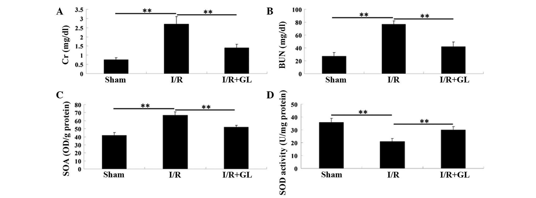 In conclusion, the present study demonstrated that pretreatment with glycyrrhizin provided marked protection for mice against I/R-induced renal injury via inhibition of inflammatory responses and renal cell apoptosis. Therefore, the administration of glycyrrhizin may be effective in the prevention of I/R-induced renal injury in abdominal surgery and kidney transplantation.