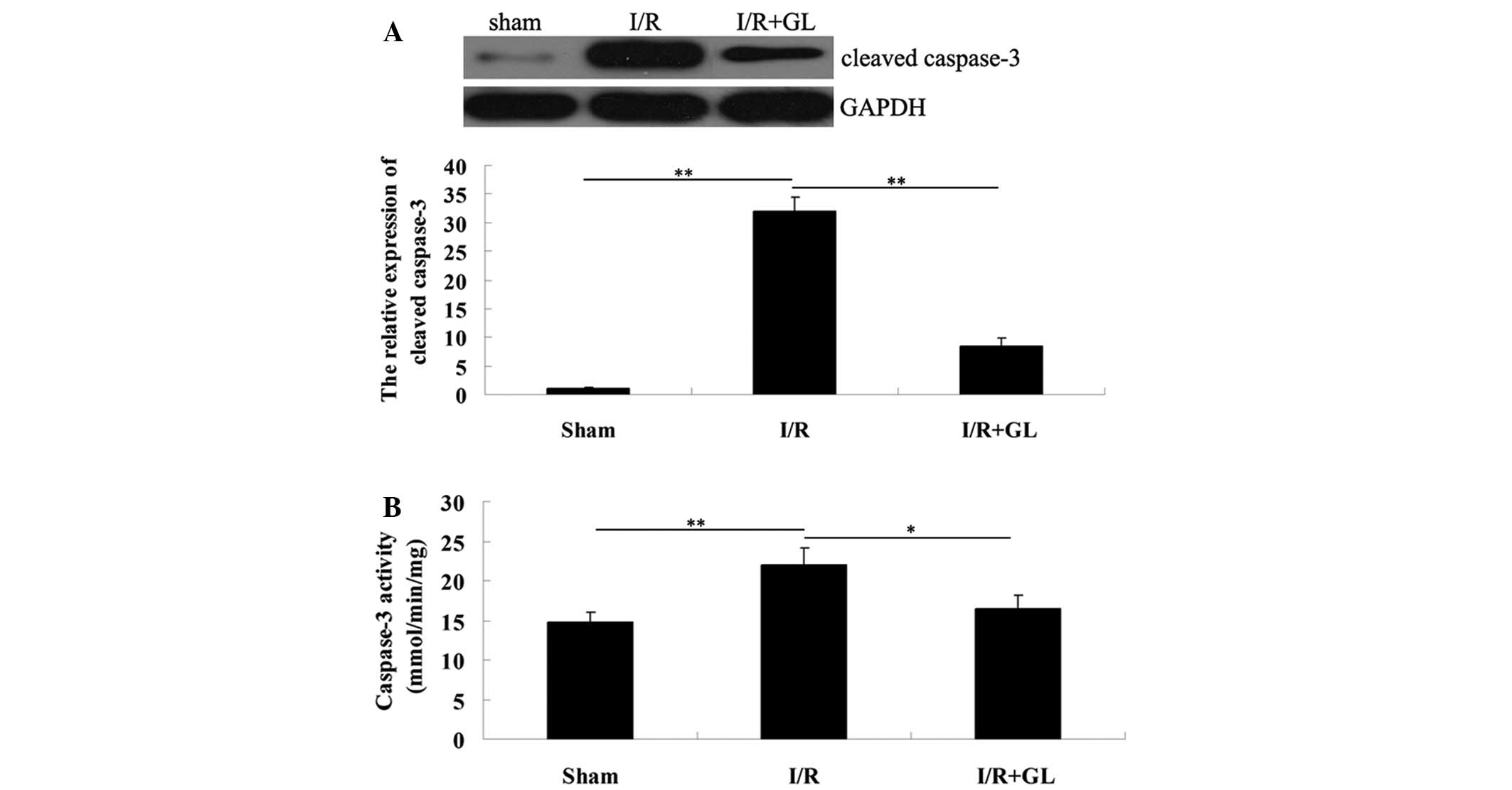 Renal cell apoptosis has been shown to be key in I/R-induced renal damage (17). Among the apoptotic mediators, activated caspase-3 acts as a final executor, as it regulates the extrinsic and intrinsic pathways of apoptosis (18,19). Furthermore, caspase-3-mediated cell apoptosis has been demonstrated to be essential in I/R-induced organ damage (20); thus, the effect of glycyrrhizin on I/R-induced renal cell apoptosis was investigated in the present study. The findings showed that administration of glycyrrhizin notably inhibited the protein level of cleaved caspase-3, (the activated form of caspase-3) within the renal tissues. Moreover, the activity of caspase-3 was downregulated as a result of glycyrrhizin administration. Therefore, it is hypothesized that glycyrrhizin may protect renal cells against I/R-induced apoptosis by suppressing caspase-3.