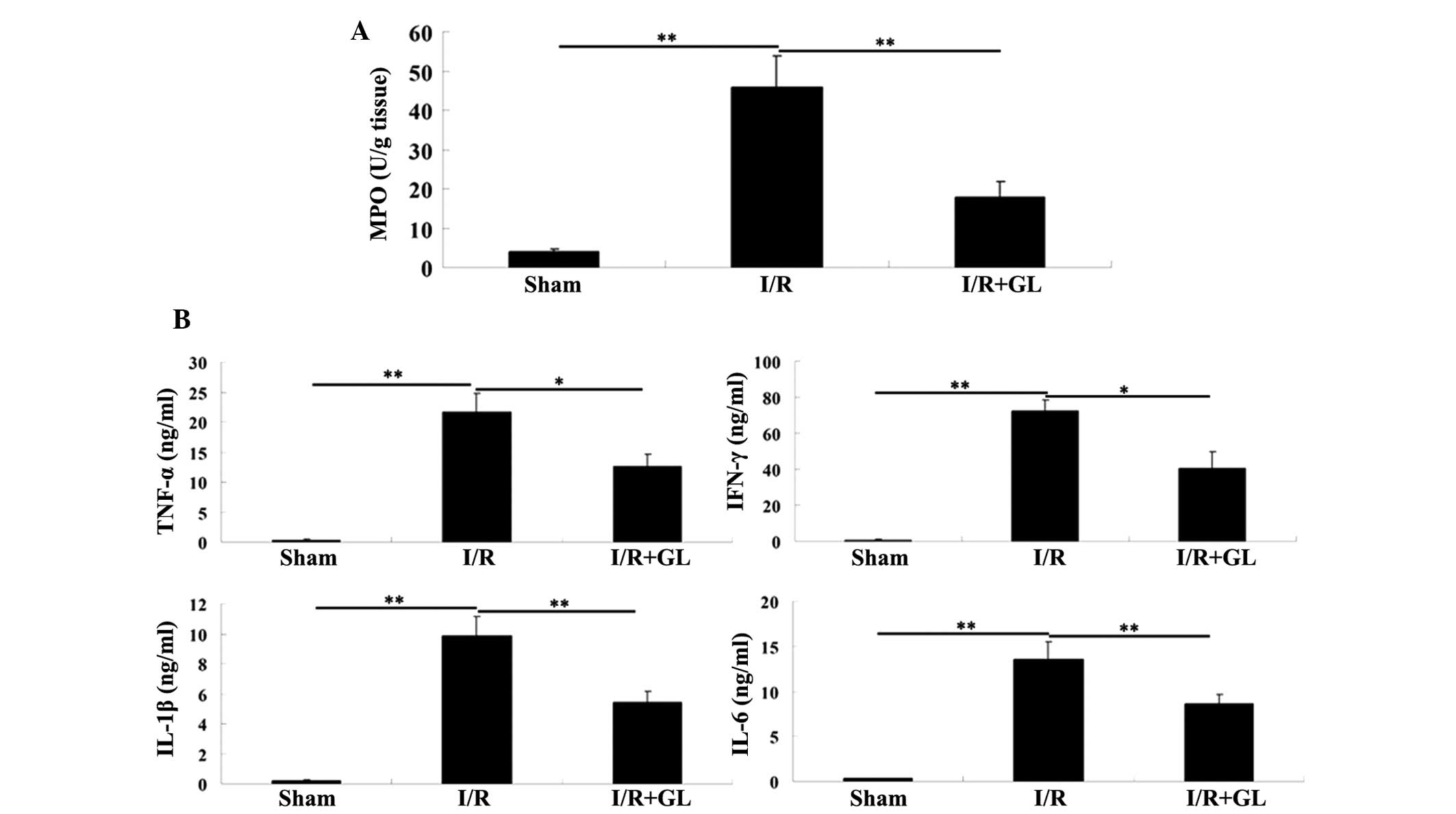 Tissue I/R damage has been identified to predominantly result from I/R-induced excessive inflammatory responses (21). When renal I/R occurs, neutrophils and macrophages initially infiltrate into the damaged kidney and secrete large quantities of pro-inflammatory mediators, which promote the infiltration of neutrophils and macrophages into the damaged tissues and further promote tissue inflammatory responses (22,23). Furthermore, infiltrated neutrophils and macrophages reduce renal blood flow, which leads to microcirculatory failure (24,25). To investigate the effect of glycyrrhizin on I/R-induced neutrophil and macrophage infiltration into damaged renal tissues, the activity of MPO, an enzyme specific to neutrophils and macrophages, was examined. The findings indicated that the administration of glycyrrhizin protects against I/R-induced macrophage and neutrophil infiltration in the renal tissue of mice. Consistently, the following findings demonstrated that the secretion of pro-inflammatory cytokines, including TNF-α, IFN-γ, IL-1β and IL-6, was markedly lower in the glycyrrhizin-treated mice compared with the saline-treated mice. Similarly, the production of IL-10, a key anti-inflammatory cytokine, was significantly higher in glycyrrhizin-treated mice compared with saline-treated mice. In addition, glycyrrhizin has been demonstrated to protect against I/R-induced tissue damage by suppressing the inflammatory response. Liu et al (11) identified that administration of glycyrrhizin reduced the serum levels of pro-inflammatory cytokines, including TNF-α, IL-6 and IL-8, in I/R-induced myocardial injury in rabbits. Zhai et al (13) indicated that the administration of glycyrrhizin significantly decreased the levels of serum TNF-α and IL-6, which protected the rat hearts against I/R injury. In accordance with these previous findings, the data from the present study indicated that glycyrrhizin protects mice against I/R-induced renal injury, via the inhibition of inflammatory responses.