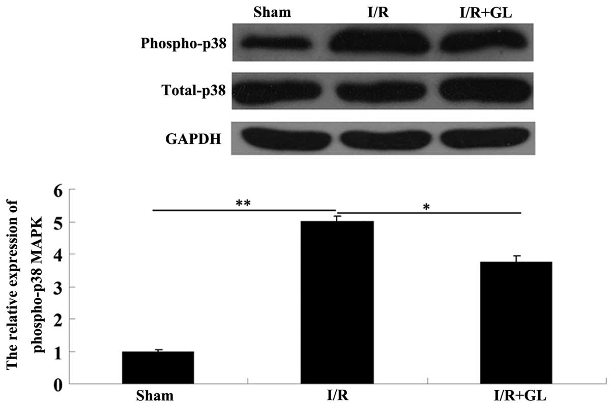 As glycyrrhizin has been reported to exhibit a suppressive effect on the activation of the p38 MAPK pathway in I/R-induced myocardial injury in rabbits, it was hypothesized that it may be similarly involved in the regulation of the p38 MAPK pathway in renal I/R damage in mice. Thus, the activity of the p38 MAPK pathway in the renal tissues was determined in each group via western blot assay. The phosphorylated-p38 MAPK protein level in the saline-treated group was significantly increased compared with the sham-operated group; however, the phosphorylated-p38 protein level in the glycyrrhizin-treated group was notably reduced compared with that in the saline-treated group (Fig. 4). These findings confirmed the hypothesis that administration of glycyrrhizin suppressed the activation of p38 MAPK in I/R-induced renal damage in mice.