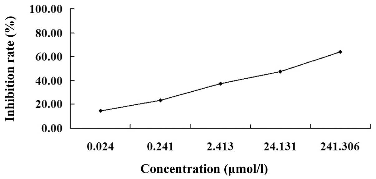 Exponentially growing cells were washed, digested with trypsin and suspended in RPMI 1640 medium until a concentration of 1×105 cells/ml was achieved. In a 96-well plate, 100 μl cell suspension per well was cultured for 24 h. The cells were subsequently incubated with varying concentrations of podophyllotoxin for a further 72 h; 12 wells were used per concentration. Cells incubated with only 100 μl RPMI 1640 culture medium served as a control group. MTT was dissolved in phosphate-buffered saline (PBS) to provide a solution with a final concentration of 0.5 mg/ml. After 72 h, the cell suspension was discarded and 200 μl MTT solution (0.5 mg/ml) was added to each well and incubated at 37°C for 4 h. All media were removed and 150 μl dimethyl sulfoxide was added to each well in order to dissolve the purple formazan crystals. The plate was agitated for 3 min and the spectrophotometric absorbance at 570 nm was measured using a microplate reader. The inhibitory rate and IC50 was calculated.