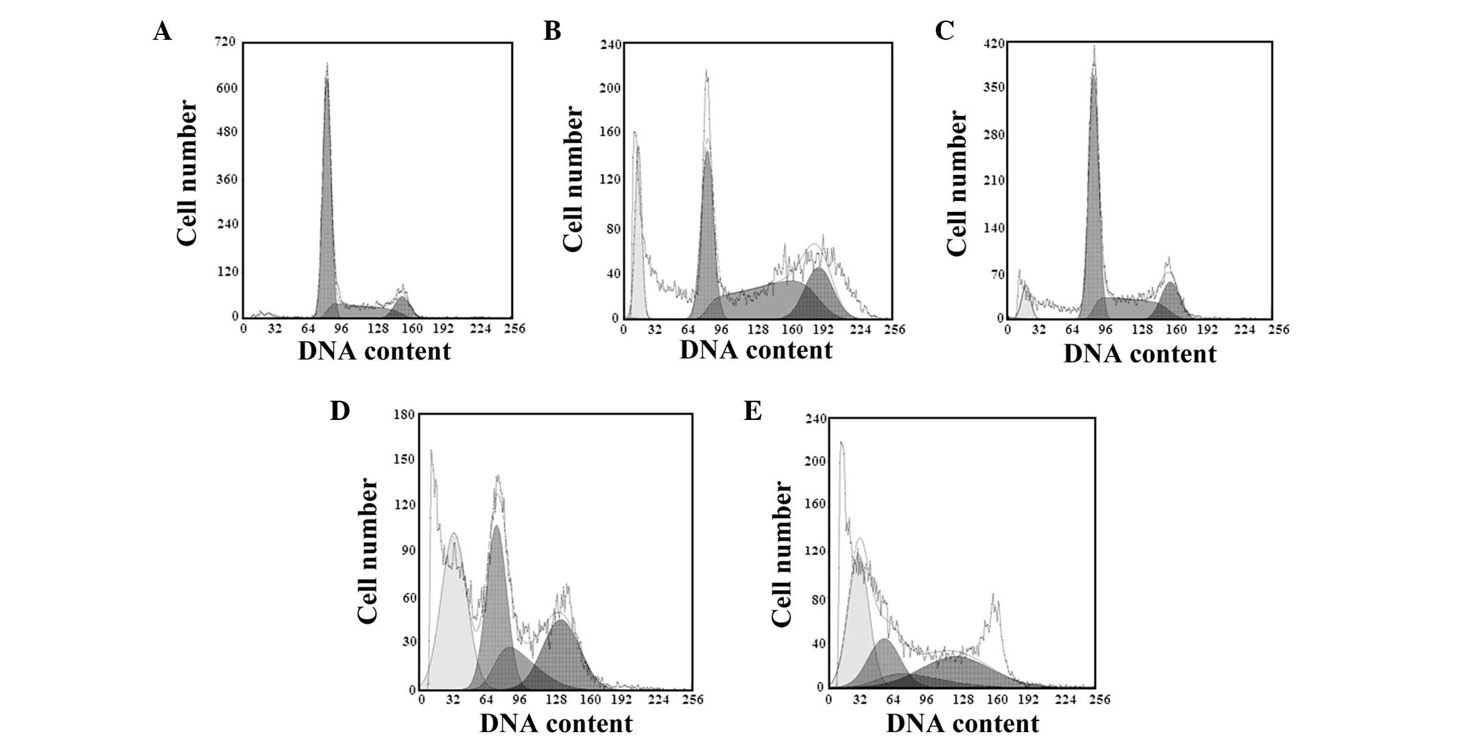 Cells (5×104/ml; 1 ml) were planted in 24-well plates and cultured for 24 h with three wells per group. Subsequently, the cells were treated with various drug concentrations for 48 h. The cells were harvested via trypsinization, washed twice with cold PBS and fixed in 70% cold ethanol for 12 h at 4°C. The fixation fluid was then discarded and the cells were washed with PBS twice. PI was added to the samples for 30 min for staining and the samples were measured by flow cytometry with an excitation wavelength of 488 nm.