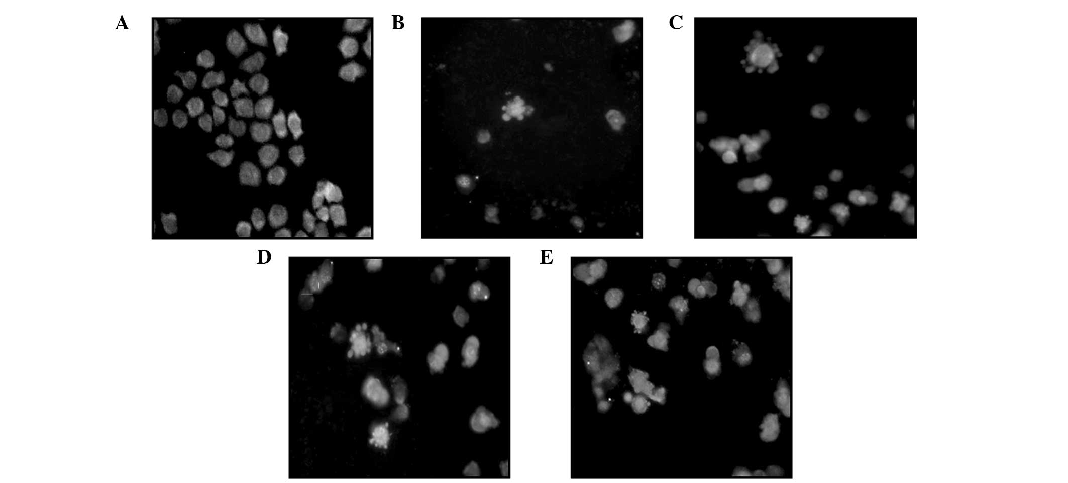 Under an inverted fluorescence microscope, the cells in the control group were observed to grow normally and the fluorescence in the cell nuclei was uniform. Following treatment with various concentrations of podophyllotoxin for 48 h, a high proportion of cells exhibited apoptosis-like changes, including cell detachment, cytoplasmic condensation and the appearance of apoptotic bodies, in a concentration-dependent manner (Fig. 3).