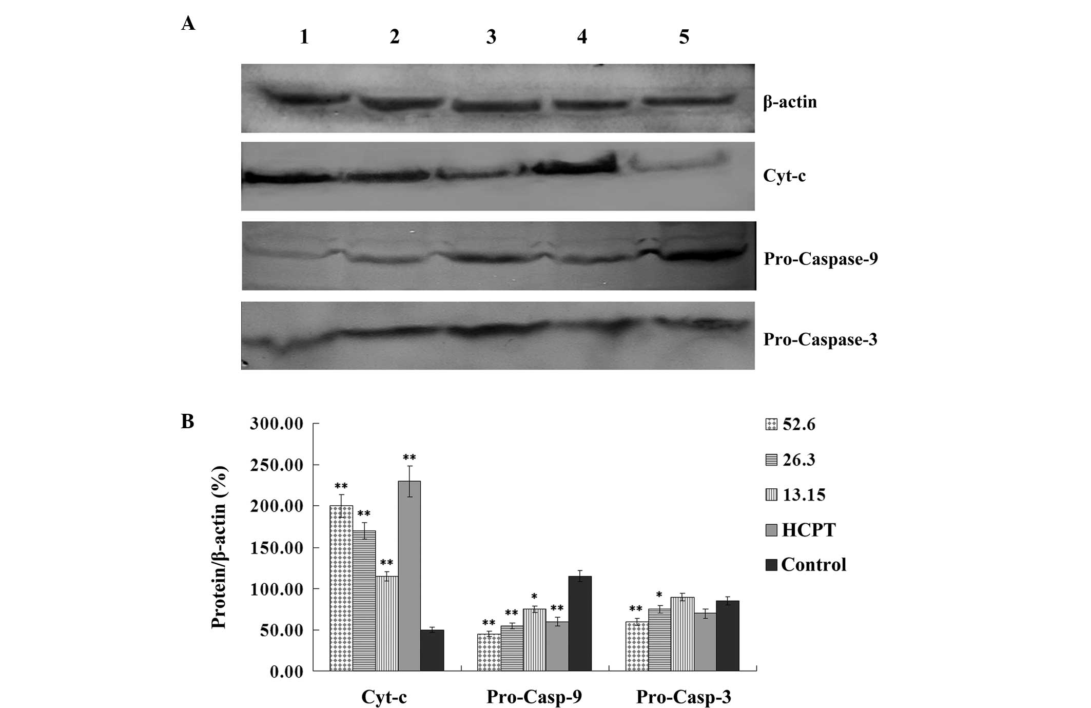 Podophyllotoxin, MTT, propidium iodide (PI), Hoechst 33258 and Rodamine 123 were all purchased from Sigma-Aldrich (St. Louis, MO, USA). Hydroxycamptothecin (HCPT) was purchased from Harbin Shengtai Pharmaceutical Co., Ltd. (Harbin, China); RPMI 1640 culture medium was purchased from Thermo Fisher Scientific Inc. (Waltham, MA, USA); fetal bovine serum (FBS) was obtained from Hangzhou Sijiqing Biological Engineering Materials Co., Ltd. (Hangzhou, China) and trypsin was purchased from Gibco-BRL (Rockville, MD, USA). Additionally, mouse anti-human β-actin, cytochrome c (cyt-c), caspase-9 and caspase-3 polyclonal antibodies, alkaline phosphatase (AP)-conjugated goat anti mouse polyclonal antibody, SDS-PAGE sample loading buffer, blocking buffer, TBST, buffer5-bromo-4-chloro-3-indolyl-phosphate (BCIP)/nitroblue tetrazolium (NBT) alkaline phosphatase color development kit (Beyotime Institute of Biotechnology, Haimen, China); detergent-compatible protein assay kit (Bio-Rad, Hercules, CA, USA).
