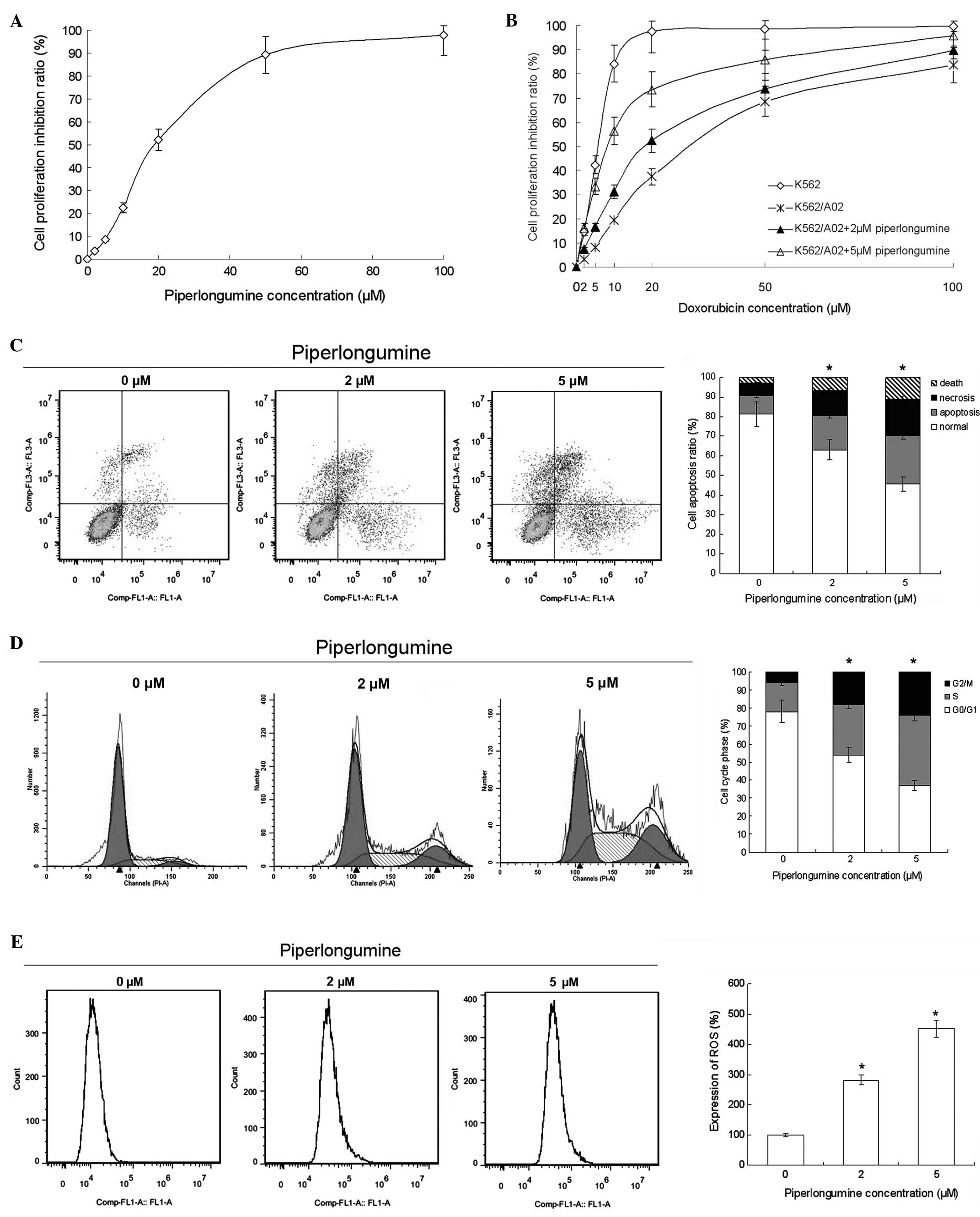 With piperlongumine treatment, the sensitivity of the K562/A02 cells to doxorubicin was improved. The reversal factor, calculated as the ratio of the IC50 of doxorubicin in the absence of piperlongumine to that in the presence of piperlongumine was 2.8 for 2 μM piperlongumine and 6.5 for 5 μM piperlongumine (Fig. 1B). The flow cytometry results indicated that piperlongumine induced apoptosis, ROS production and cell cycle arrest in the K562/A02 cells. The cell cycle was arrested at the G2/M phase (Fig. 1C). These results suggest that piperlongumine reverses the doxorubicin-resistance of K562/A02 cells by inducing apoptosis, ROS production and cell cycle arrest.