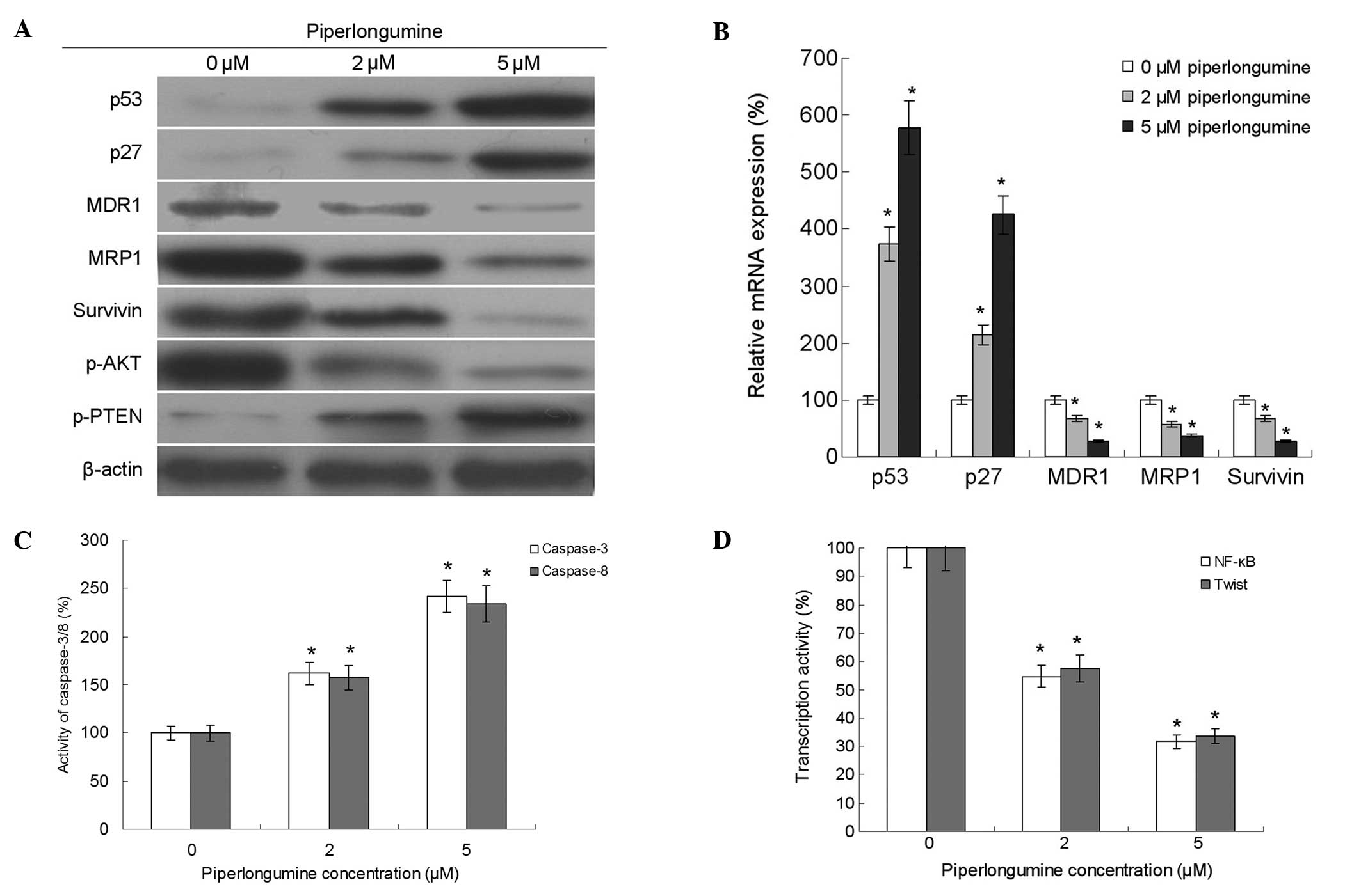 The proliferation and survival of tumor cells may be increased by the regulation of drug resistance-related genes and signaling pathways (13). In the present study, the expression levels of MDR1, MRP1, survivin, p53 and p27 and the activity of caspase-3/8 were detected. The results showed that piperlongumine decreased the expression of MDR1, MRP1 and survivin, and increased the expression of p53 and p27 and the activities of caspase-3 and -8. Furthermore, the results also showed that piperlongumine decreased the phosphorylation of Akt and the transcriptional activities of NF-κB and twist. In addition, it increased the phosphorylation of PTEN (Fig. 3).