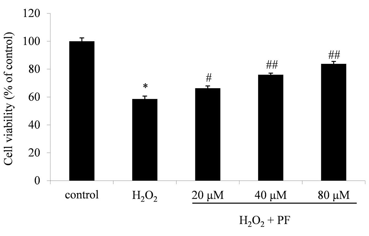 Cell viability was measured using an MTT assay as described in a previous study (9). The PC12 cells received different treatments, including no treatment (control), 200 µM H2O2 alone or 200 µM H2O2 in combination with 20, 40 or 80 µM PF. Briefly, the cells were seeded into 96-well plates (3.0×103/well) and cultured for 6 h. MTT solution (5 mg/ml; Sigma-Aldrich, St. Louis, MO, USA) was added to each well and incubated for 4 h. Next, 150 µl dimethyl sulfoxide (DMSO; Sigma-Aldrich) was added to dissolve the formazan precipitate. Absorbance was then measured at 570 nm using a ThermoMax microplate reader (Molecular Devices LLC, Sunnyvale, CA, USA). Cell viability is expressed as a percentage relative to the untreated control.