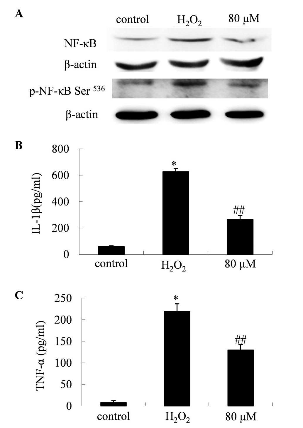 Oxidative stress-induced neuroinflammation has been reported to be a vital factor in nerve injury and associated diseases (5,8,21). Numerous studies have suggested that chronic inflammation is implicated in neurodegenerative disease and injury (1,4,21–23). A number of well-established inflammatory target proteins, including matrix metalloproteinase-9, cyclooxygenase-2, inducible nitric oxide synthase and certain adhesion molecules have been associated with ROS generation, which is also induced by proinflammatory cytokines, peptides, peroxidants and infection (5,13,24,25). Increasing inflammatory stress has been reported to correlate with oxidative stress during the progression of neurodegenerative disease (5,19,26). NF-κB, a proinflammatory transcription factor, functions as the ‘first responder’ to various generators of cellular stress, including free radicals and pro-inflammatory cytokines (e.g. TNF-α) and bacterial biomolecules) (27). In the present study, H2O2 was observed to induce an inflammatory response involving NF-κB and its associated signals. Following H2O2 treatment, the levels of NF-κB and its active form, p-NF-κB (Ser536), were elevated, as were the levels of TNF-α and IL-1β. However, cells cocultured with 80 µM PF exhibited reduced levels of these inflammatory factors, indicating that PF modified the apoptotic process, in addition to correcting the abnormal inflammatory signals induced by H2O2.