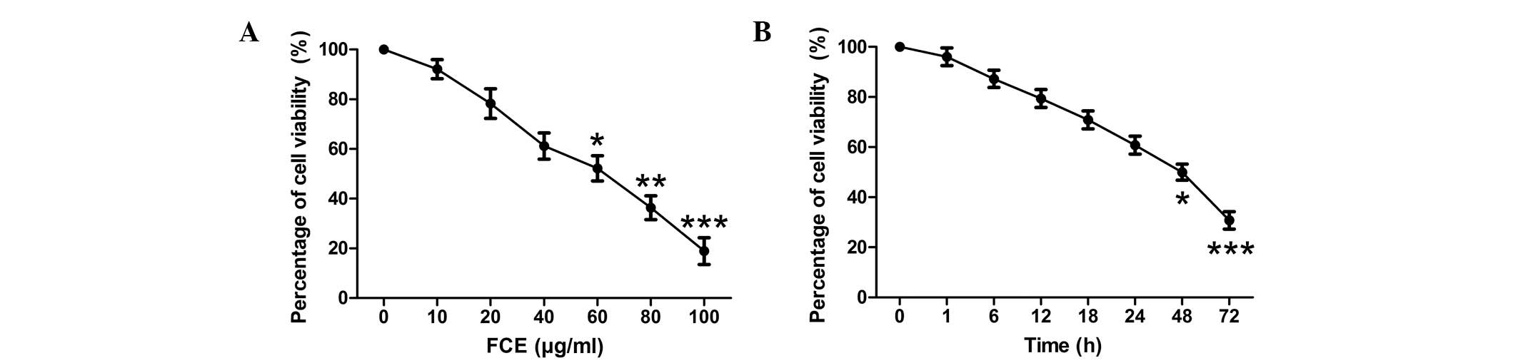 To examine the effects of FCE treatment on cell proliferation, MTT assays were used to detect the viability of PC12 cells. When the PC12 cells were treated with various concentrations of FCE for 48 h, the proliferation of PC12 cells was inhibited in a concentration-dependent manner (Fig. 1A). According to the inhibitory rates of FCE at different concentrations on PC12 cells (data not shown), the IC50 was 58.248 µg/ml. A concentration of 60 µg/ml FCE was selected for use in this study. Furthermore, a time-dependent reduction in cell viability was observed (Fig. 1B). The PC12 cells were incubated for 48 h with different treatments prior to the following experiments.