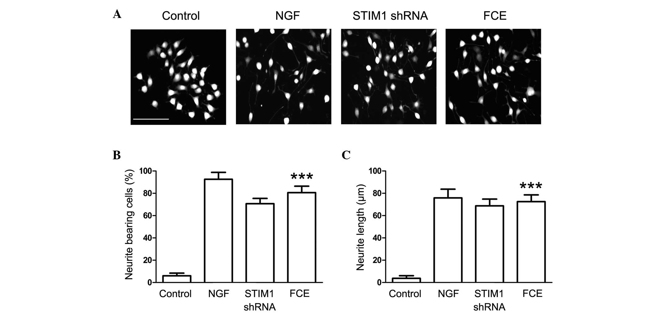 In conclusion, the findings of the present study provide the first evidence of induction of neurite outgrowth in PC12 cells by the traditional Chinese herbal medicine FCE. Additionally, the results demonstrate that FCE-induced neuritogenesis is associated with the suppression of STIM1 expression and the inhibition of Ca2+ influx. These results provide a useful information regarding the therapeutic potential of FCE for the treatment of neurodegenerative disease.