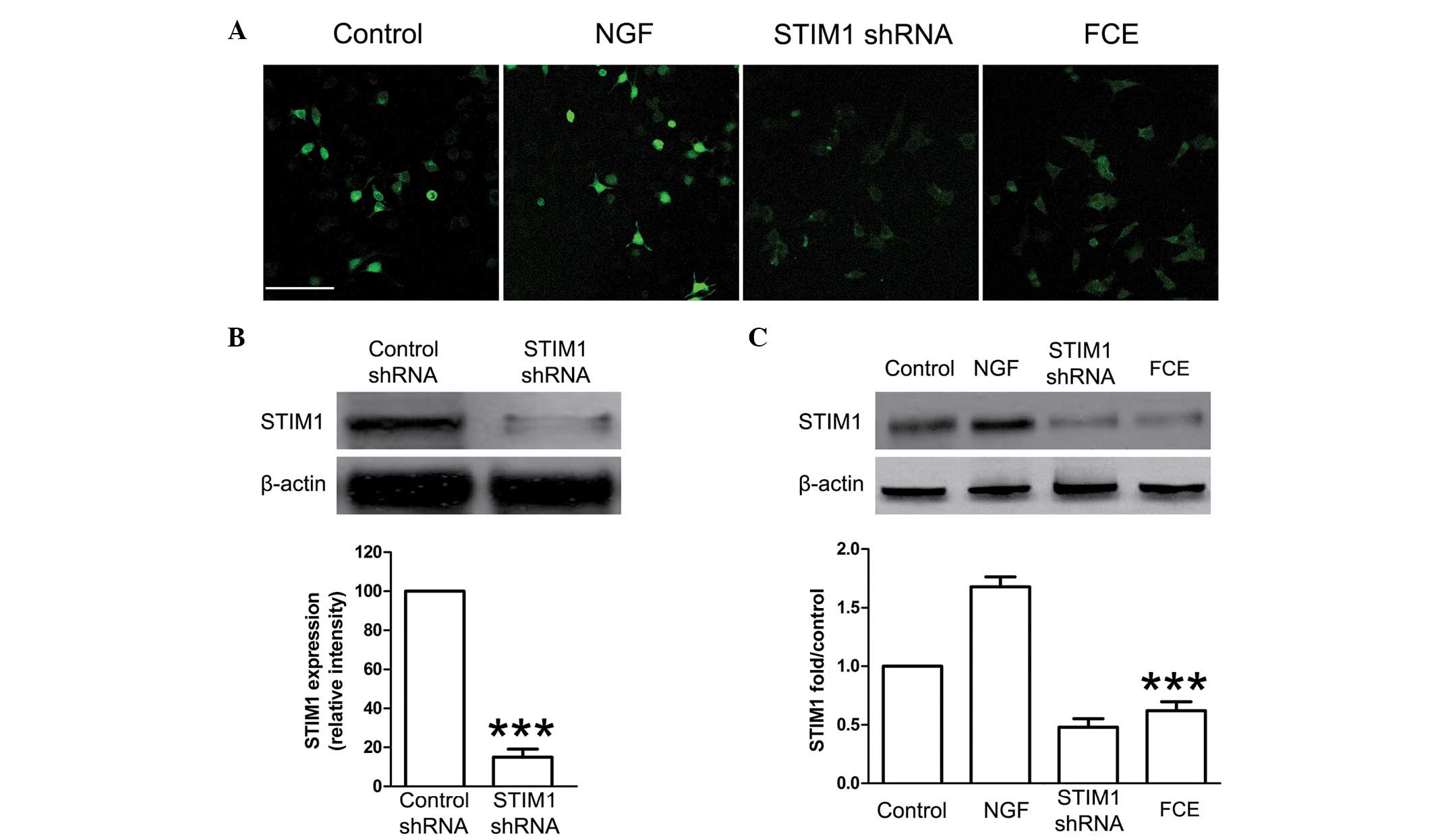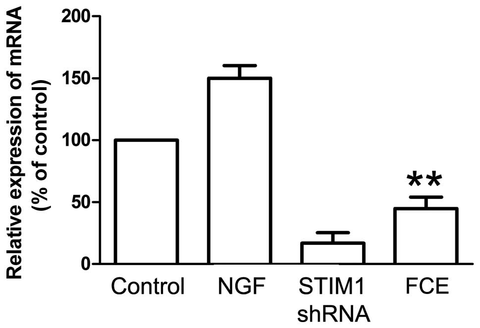 SOCCs, including STIM1, play a important role in cellular proliferation and differentiation. In this study, the knockdown of STIM1 expression with specifically targeted shRNA was carried out, and it effectively reduced the expression of STIM1 mRNA (Fig. 3) and protein (Fig. 4B). Treatment with FCE also reduced the mRNA expression of STIM1 in the PC12 cells (Fig. 3), concurrently with its inducing effect on neurite outgrowth. Immunofluorescence staining confirmed that FCE treatment suppressed the expression of STIM1 protein in PC12 cells (Fig. 4A). Consistent with these results, the expression of STIM1 protein was also found to be significantly decreased in the FCE treatment group compared with the control group by western blot assay (Fig. 4C).