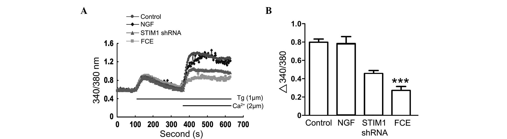 Rat β-nerve growth factor (NGF) was purchased from R&D Systems (Minneapolis, MN, USA). 3-(4,5-Dimethylthiazol-2-yl)-2,5-diphenyltetrazolium (MTT) was obtained from Sigma-Aldrich. Rabbit polyclonal anti-STIM1 (S6072) and mouse monoclonal anti-β-actin (A5316) antibodies were purchased from Sigma-Aldrich.