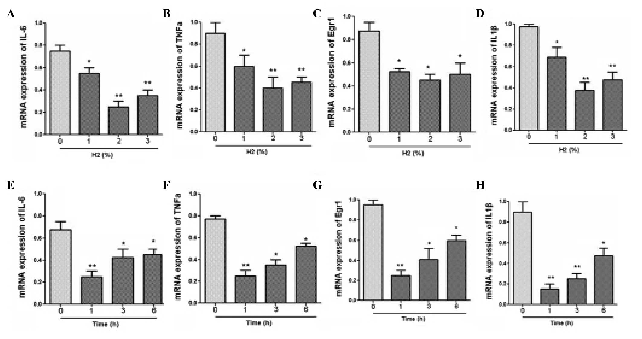 The mRNA expression of IL-6, TNF-α, Egr-1 and IL-1β was measured using qPCR. Results revealed that hydrogen administration at 2% concentration significantly downregulated the mRNA levels of IL-6, TNF-α, Egr-1 and IL-1β (Fig. 2). In addition, the expression levels of these cytokines were clearly decreased after hydrogen treatment for a period of 1 h (Fig. 2). The expression levels of IL-6 and TNF-α in serum were further examined using an ELISA. As demonstrated in Fig. 3, hydrogen gas inhalation at a concentration of 2% and a duration of 1 h led to marked reductions in the levels of IL-6 and TNF-α expression.