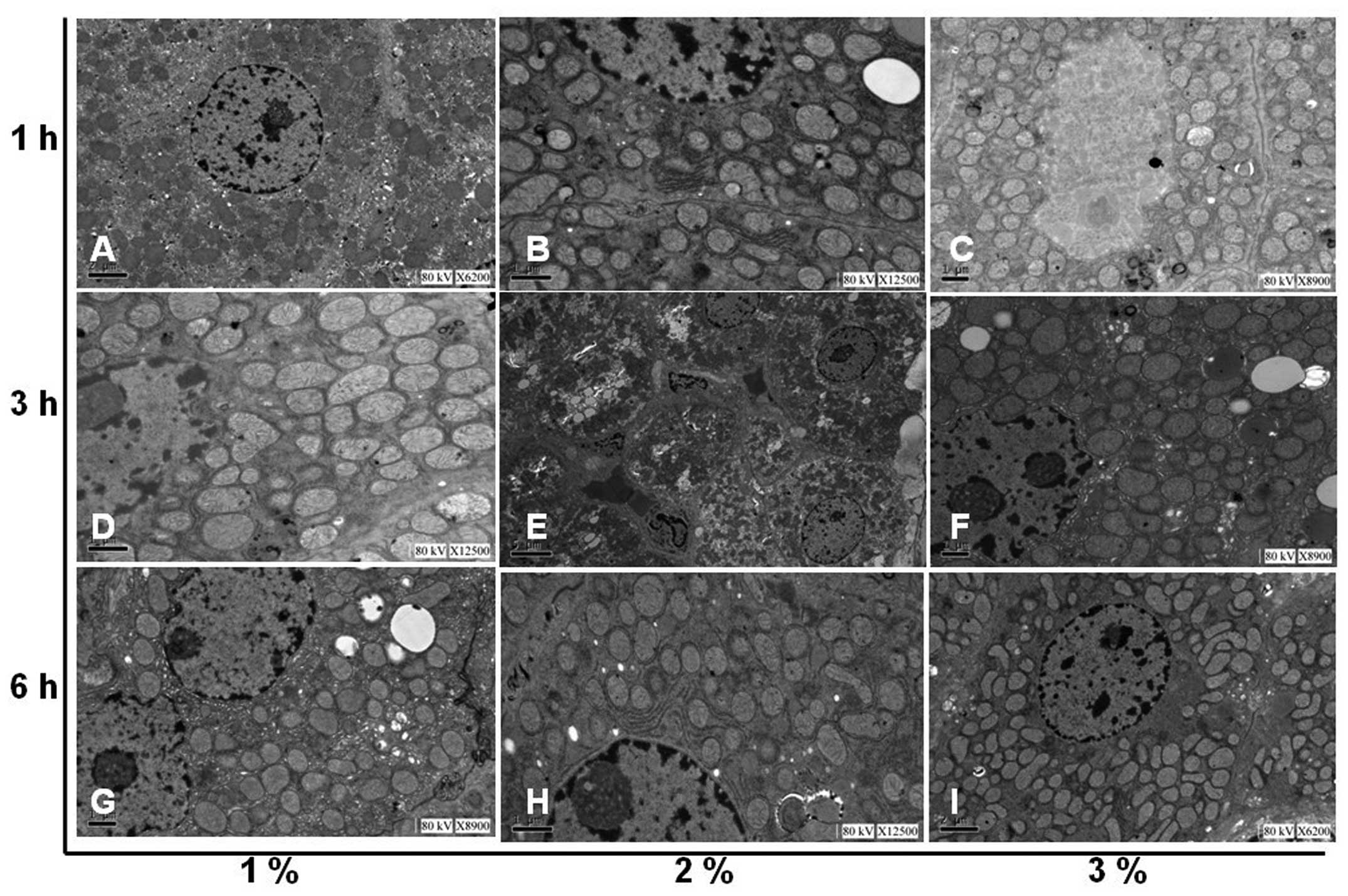 The effect of hydrogen gas treatment on histopathological changes in the livers of rats with I/R is demonstrated in Fig. 4. Morphological examination revealed that the liver tissues of rats with I/R injury were severely damaged in the control group with severe edema, alveolar hemorrhage and extensive inflammatory cell infiltration. In the experimental groups, hydrogen treatment significantly alleviated liver edema, alveolar hemorrhage and inflammatory cell infiltration, suggesting that the liver injury induced by I/R was reduced by hydrogen treatment. In addition, following exposure to hydrogen, the morphological changes in subcellular structures in the liver tissues were further examined using a TEM. Gross morphological changes in the liver were clearly observed in the control group while hydrogen administration markedly reduced the I/R injury in the experimental groups (Fig. 5).