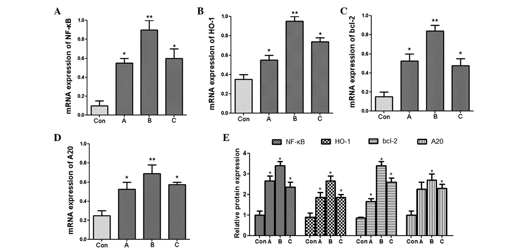 The liver tissues were lysed with TRIzol® (Invitrogen Life Technologies, Carlsbad, CA, USA) and vigorously mixed with chloroform for 15 sec, then stored at room temperature for 3 min. Subsequently, they were centrifuged at 12,000 × g for 15 min at 4°C and the RNA was precipitated in the aqueous phase with isopropanol. The upper aqueous phase was transferred to a new microcentrifuge tube. The RNA was precipitated by adding 0.75% ethanol and centrifuged at 12,000 × g for ≤5 min at 4°C. The supernatant was removed and the RNA was dried at room temperature for 5–10 min. The mRNA expression levels of zinc finger protein A20 (A20), nuclear factor κB (NF-κB), heme oxygenase-1 (HO-1) and B-cell lymphoma 2 (Bcl-2) were determined using qPCR with glyceraldehyde 3-phosphate dehydrogenase (GAPDH) used as a control. The expression levels of interleukin (IL)-6, tumor necrosis factor (TNF)-α, early growth response protein 1 (Egr-1) and IL-1β mRNA were also determined. The qPCR reactions were performed using an ABI 7500 Real-Time PCR system (Applied Biosystems, Foster City, CA, USA) with the following conditions: 95°C, 10 min for one cycle; and then 95°C, 15 sec, 60°C, 1 min for 40 cycles. The expression levels of mRNA were quantified with 2−∆∆CT. The primer sequences are listed in Table I.