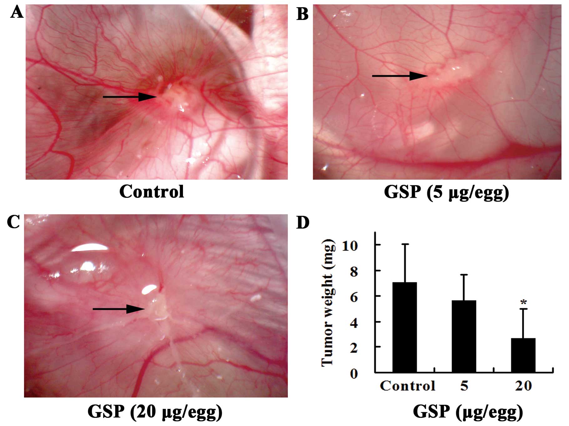 SW620 cells inoculated on chick CAM formed solid, avascular tumor within the first day. Two days after inoculation, the tumor became vascularized and grew rapidly. Five days later, numerous vessels developed radially around the tumor. Vessels at the tumor surface were clearly visible in the control group (Fig. 2A). Local treatment of the tumor from Day 3 to Day 7 (the day when SW620 cells were inoculated was designated as Day 1) with GSPs markedly inhibited tumor-induced angiogenesis. The tumor appeared white (Fig. 2B and C). The growth of the tumor was also inhibited by GSP treatment (Fig. 2D). During the experiment, some chick embryos from both the control and the GSP-treated groups died before the end of the experiment and were not included in the results shown. However, there was no significant difference in the incidence of embryonic death between GSP-treated and control groups, indicating that the inhibitory effect of GSP on tumor-induced angiogenesis was not related to toxic effects.
