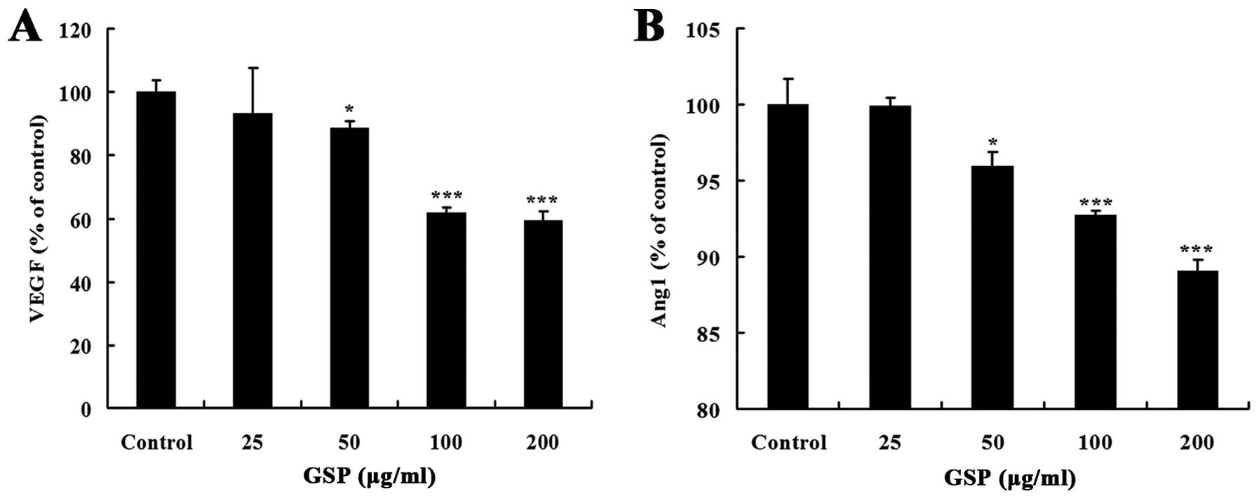 Solid tumors secrete various proangiogenic factors, such as VEGF and Ang1, to activate the nearest endothelial cells in the host tissue for neoangiogenesis (32). In the present study, we investigated whether GSPs could inhibit proangiogenic attributes of colon cancer SW620 cells. GSP treatment for 24 h inhibited both VEGF and Ang1 expression in a dose-dependent manner (Fig. 3). The inhibitory effect on VEGF expression was stronger than on Ang1 expression. These results suggest that the inhibitory effect of GSPs on tumor-induced angiogenesis is partly through suppressing the expression of angiogenic factors that initiate tumor angiogenesis in SW620 cells.