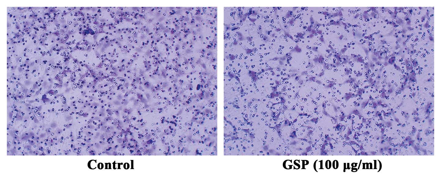 Both VEGF and Ang1 are chemotactic factors specific for endothelial cells. To further verify that GSPs inhibit tumor-induced angiogenesis by suppressing the expression of both VEGF and Ang1 in tumor cells, we conducted endothelial cell migration assay to examine the effect of conditioned medium from either GSP-treated or untreated SW620 cells on endothelial cell migration. Conditioned medium collected from SW620 cells induced endothelial cell migration (Fig. 4). However, endothelial cell migration was suppressed by conditioned medium collected from 100 μg/ml GSP-treated SW620 cells. These results further verified that the inhibitory effect of GSP on tumor-induced angiogenesis is mediated by reducing the expression of proangiogenic factors in SW620 cells.