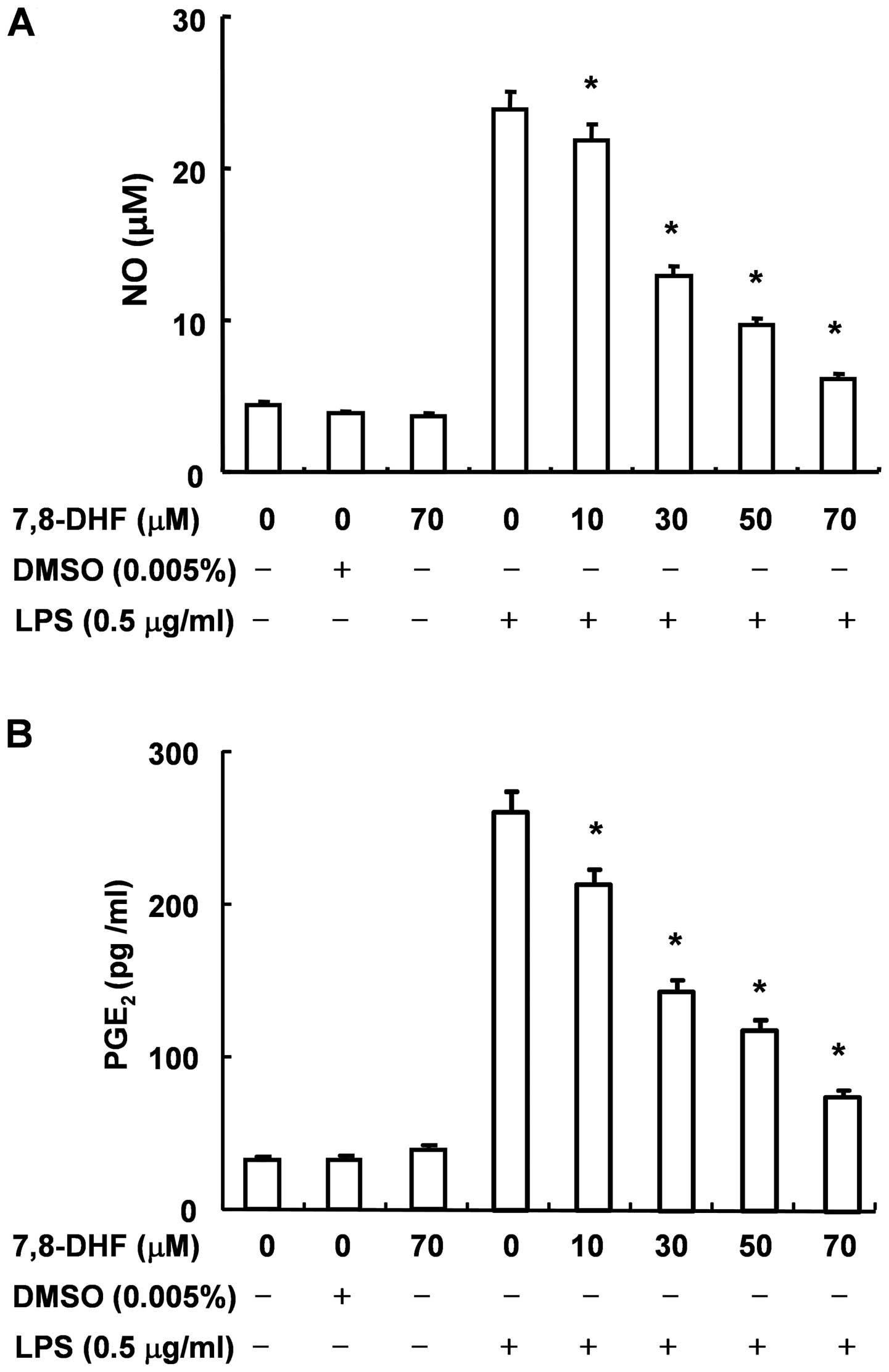 To evaluate the inhibitory effects of 7,8-DHF on LPS-stimulated NO production in BV2 microglial cells, NO levels in the cell culture medium were measured by Griess assay. For this experiment the, BV2 microglial cells were pre-treated with various concentrations of 7,8-DHF (10–70 μM) for 1 h prior to being stimulated with LPS (0.5 μg/ml). According to the NO detection assay, LPS alone was able to markedly induce NO production by the cells. Pre-treatment with 7,8-DHF significantly repressed the levels of NO production in LPS-stimulated BV2 microglial cells in a concentration-dependent manner (Fig. 1A).
