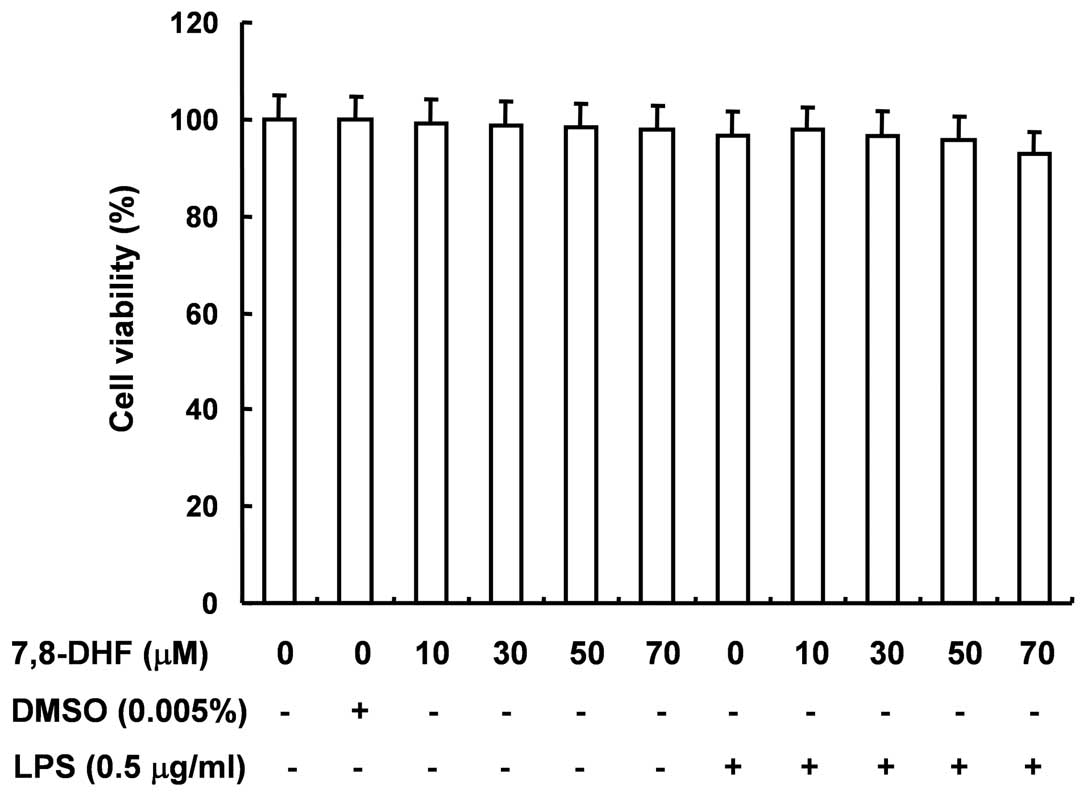 In order to exclude the cytotoxic effects of 7,8-DHF on the growth of BV2 microglial cells, the cells were exposed to various concentrations of 7,8-DHF for 24 h in the presence or absence of LPS, and cell viability was then measured by MTT assay. The concentrations of 7,8-DHF used to inhibit NO and PGE2 production did not affect cell viability (Fig. 2). These results clearly indicated that the inhibition of NO and PGE2 production in LPS-stimulated BV2 cells was not due to a cytotoxic action of 7,8-DHF.