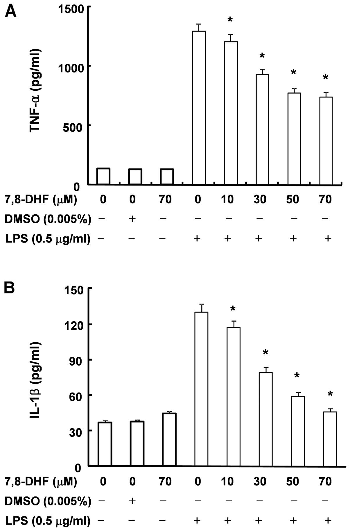 The levels of IL-1β and TNF-α were measured by ELISA kits (R&D Systems, Minneapolis, MN, USA) according to the manufacturer’s instructions. Briefly, the BV2 microglial cells (5×105 cells/ml) were plated in 24-well plates and pre-treated with the indicated concentrations of 7,8-DHF for 1 h prior to treatment with 0.5 μg/ml LPS for 24 h. One hundred microliters of culture-medium supernatants were collected for determination of the IL-1β and TNF-α concentrations by ELISA, as previously described (26).