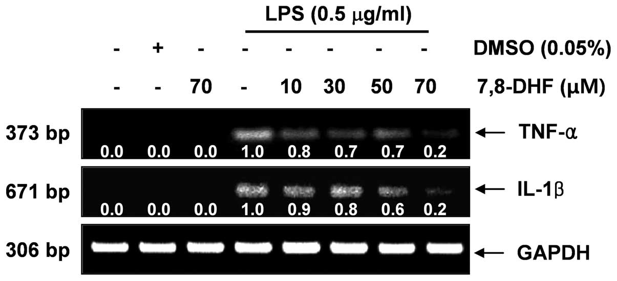 Next, we analyzed the effects of 7,8-DHF on the production of pro-inflammatory cytokines, such as IL-1β and TNF-α. The levels of IL-1β and TNF-α production were markedly increased in the culture medium of LPS-stimulated BV2 microglial cells (Fig. 4). Pre-treatment with 7,8-DHF resulted in a significant decrease in the release of these pro-inflammatory cytokines in a concentration-dependent manner. In a parallel experiment, using RT-PCR, we investigated the effects of 7,8-DHF on LPS-induced IL-1β and TNF-α mRNA expression. IL-1β and TNF-α mRNA transcription also decreased following treatment with 7,8-DHF (Fig. 5). These results suggest that 7,8-DHF is effective in the suppression of pro-inflammatory cytokine production through the alteration of the transcription levels of IL-1β and TNF-α in activated microglial cells.